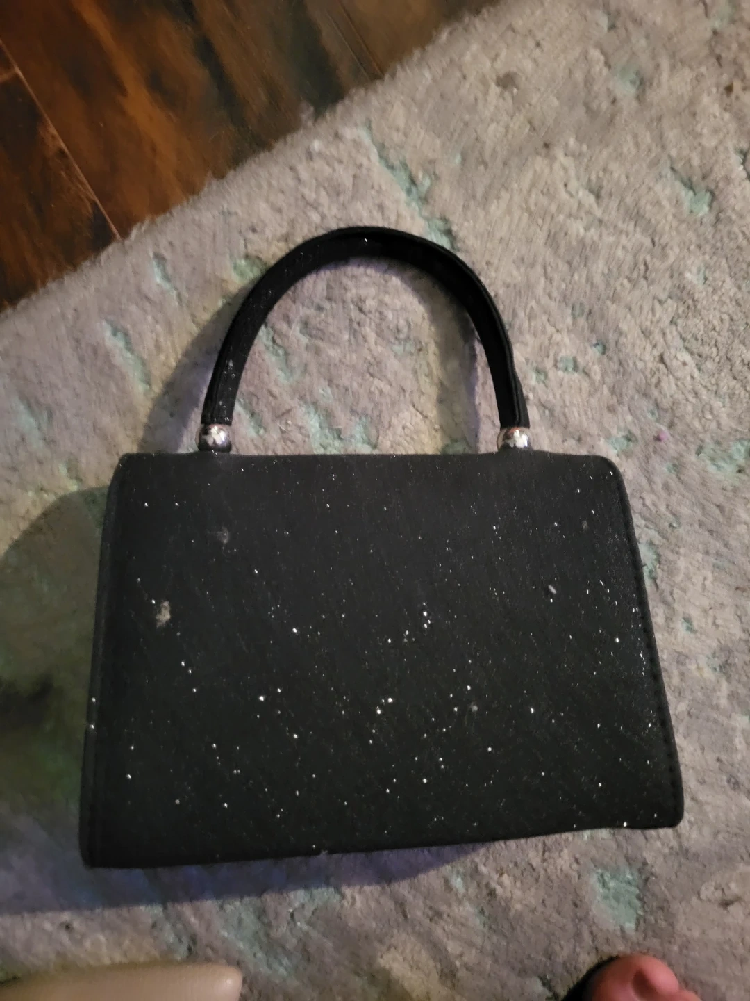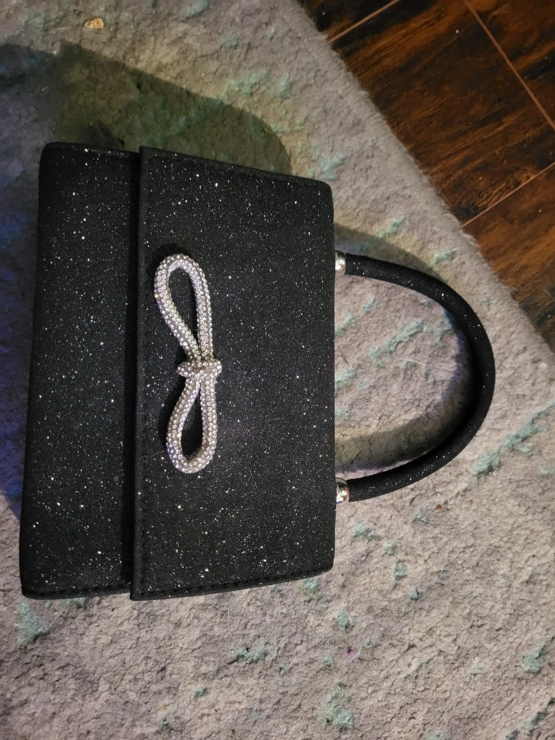 This cute black evening bag is perfect for a night out! It has a sparkly exterior and a bow detail on the front. It also comes with a chain strap that can be attached inside