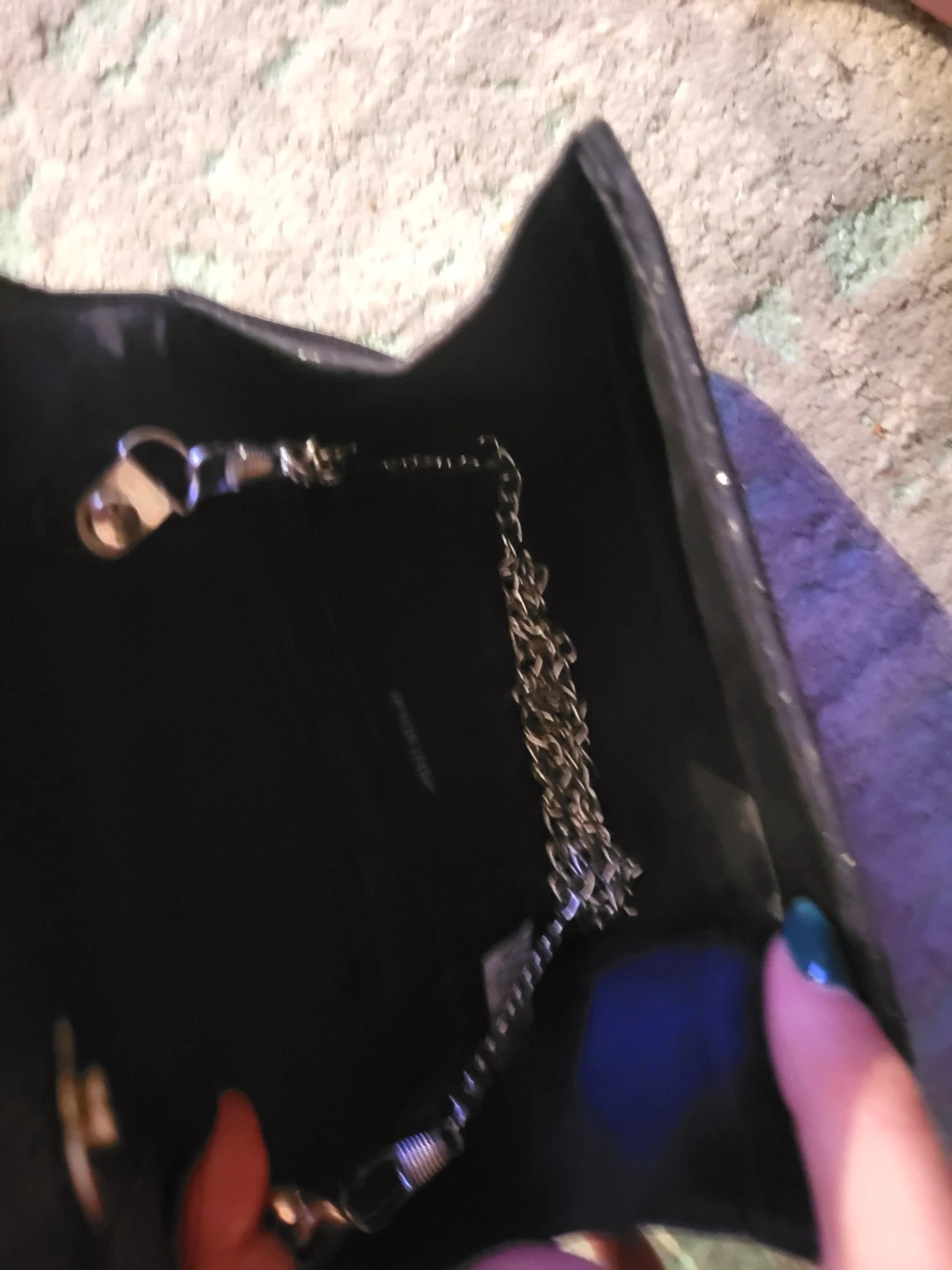 This cute black evening bag is perfect for a night out! It has a sparkly exterior and a bow detail on the front. It also comes with a chain strap that can be attached inside