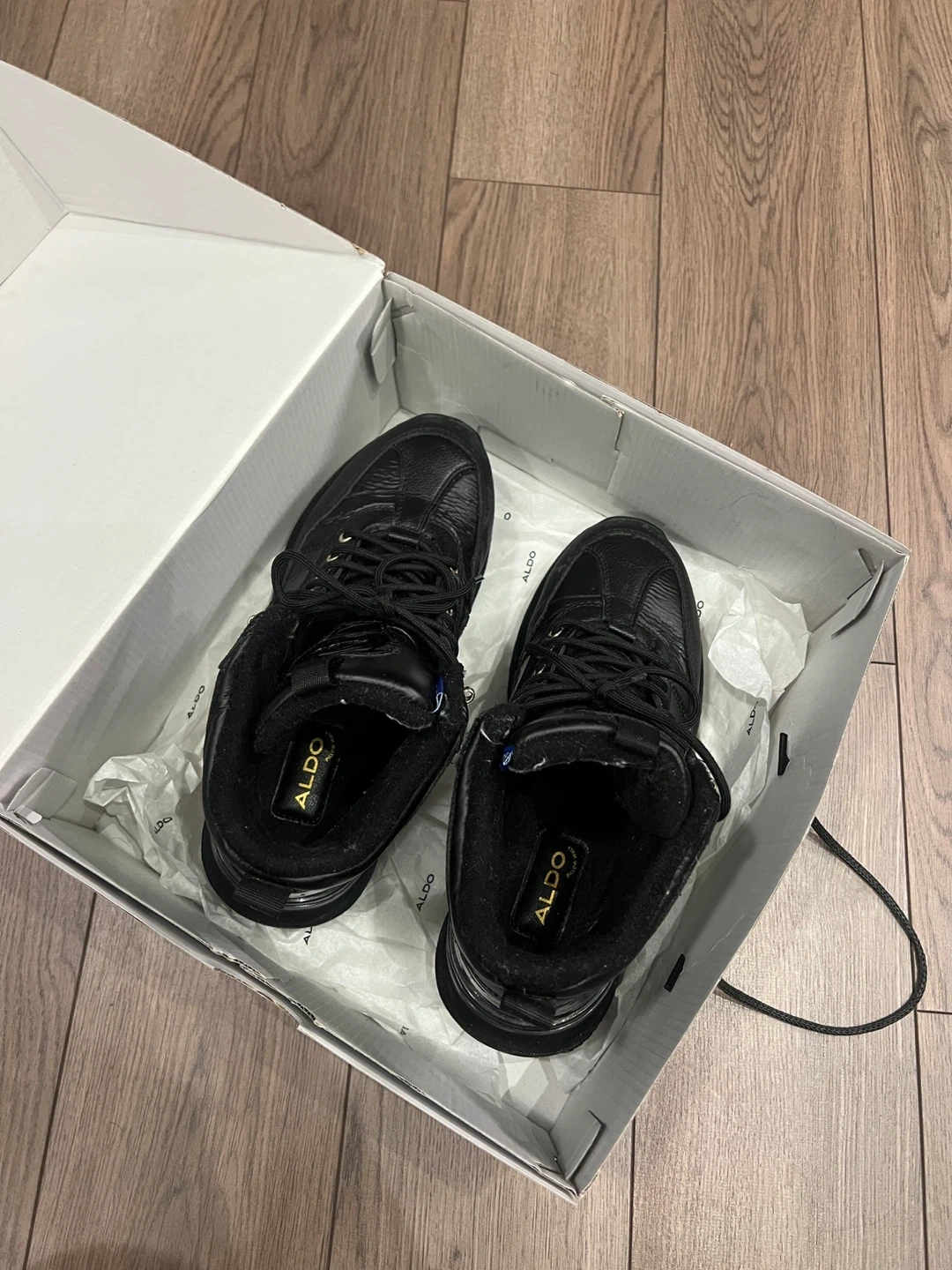 Selling a pair of Aldo black leather boots. They come with the original box! Perfect for adding a bit of edge to your style while keeping comfy. Size is smaller for me thats why selling it