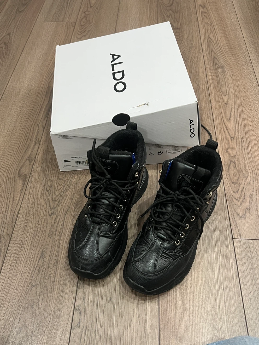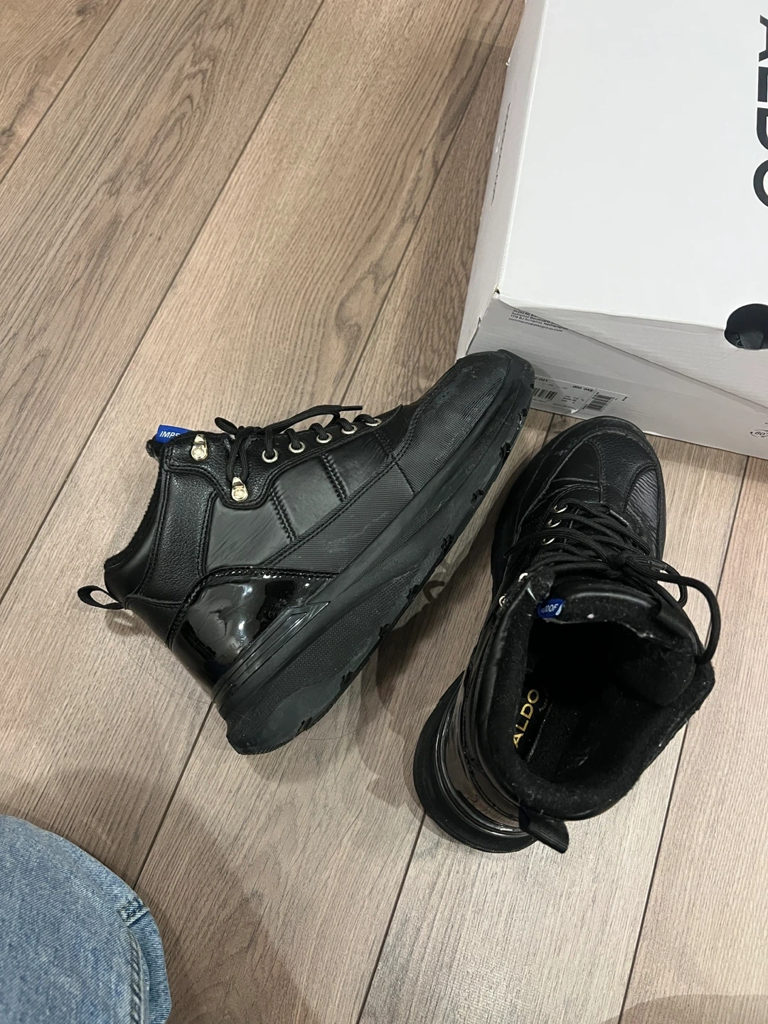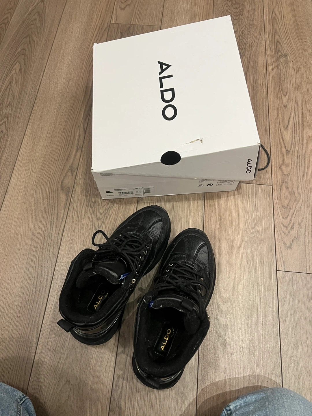 Selling a pair of Aldo black leather boots. They come with the original box! Perfect for adding a bit of edge to your style while keeping comfy. Size is smaller for me thats why selling it