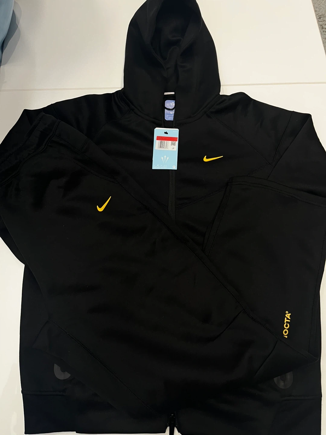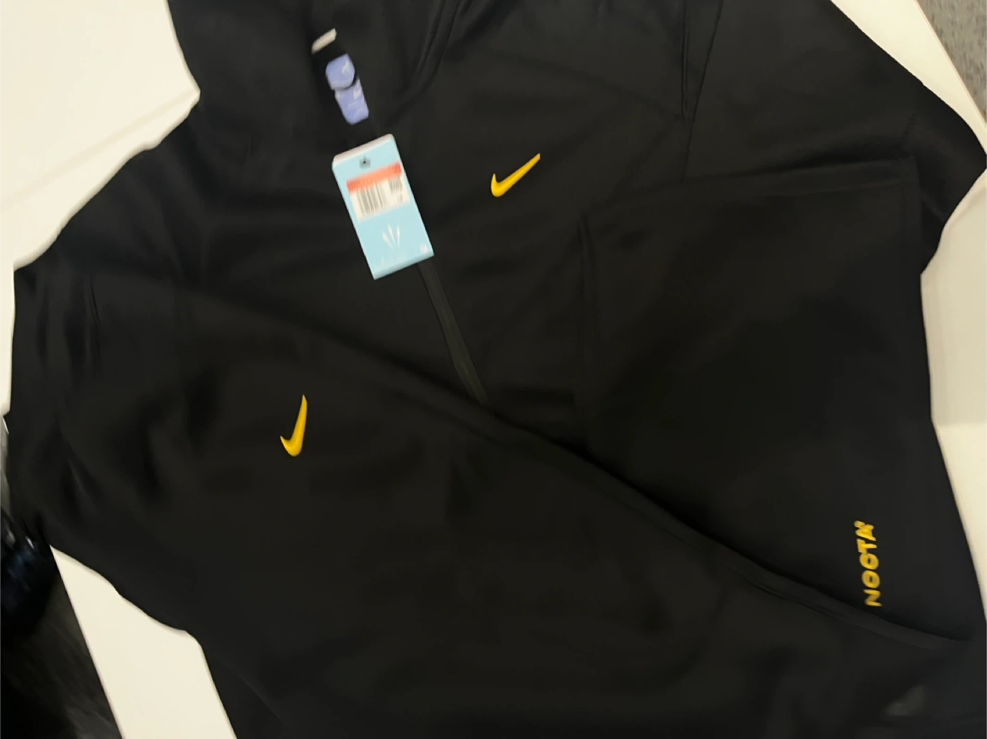 Selling a Nike x NOCTA tracksuit in black with yellow accents. It's in great condition and ready for a new owner! Perfect for workouts or casual wear. Size is not indicated on the tag, please refer to the measurements in the photos to ensure a good fit