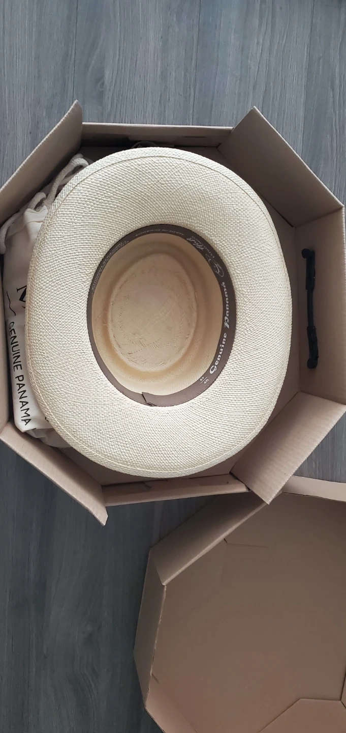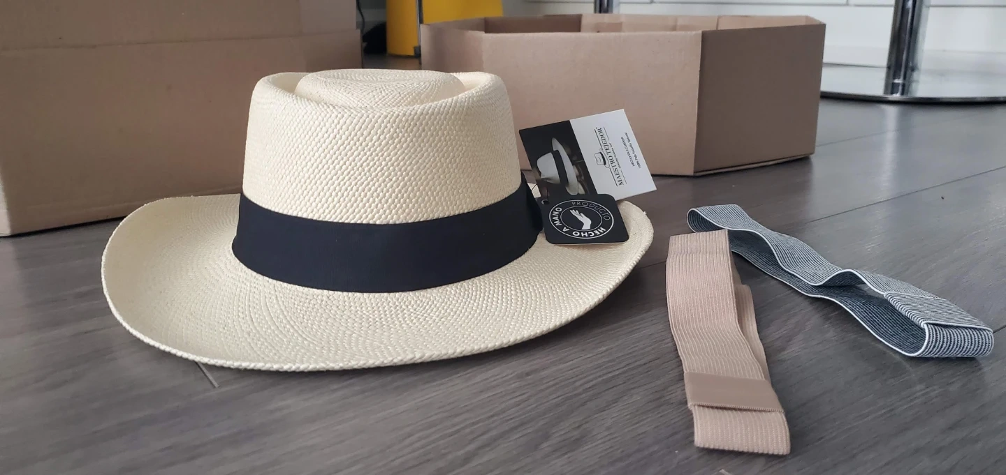 Selling a Maestro Tejedor Genuine Panama Hat! It comes with its original box and accessories, including a dust bag, extra hat bands, and a certificate of authenticity. This stylish hat is perfect for sunny days and special occasions.