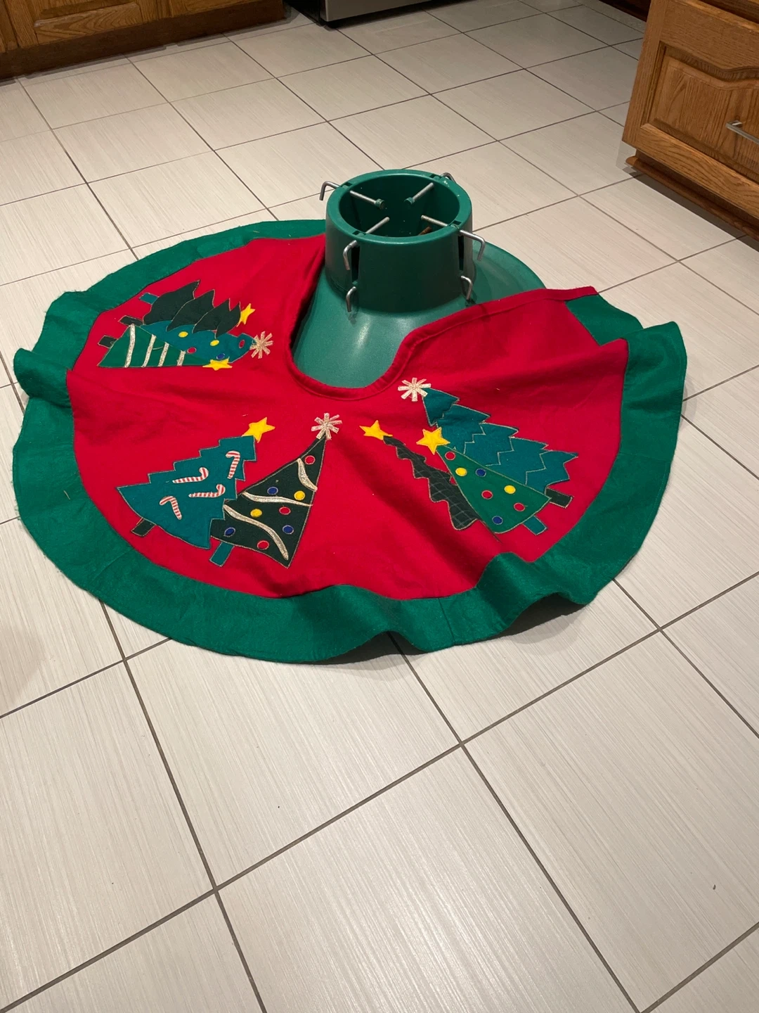 Here's a Christmas tree stand with a festive tree skirt! The skirt is red with green trim and features Christmas tree designs. It will surely add a touch of holiday cheer to your home this season