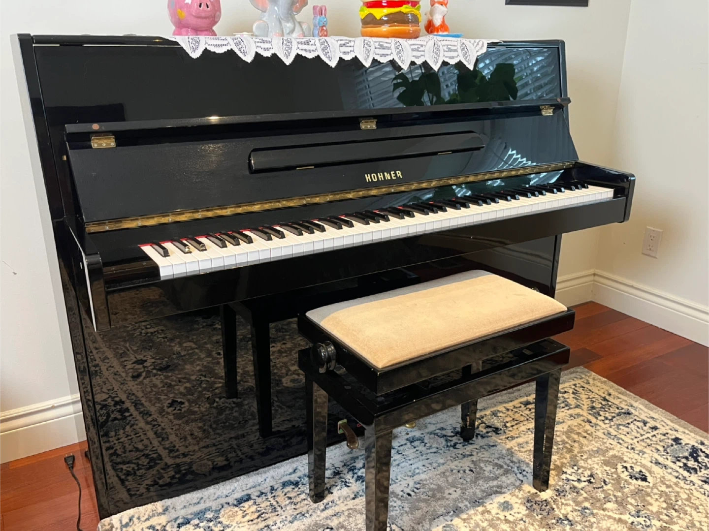 Selling a Hohner upright piano in good condition. It comes with a matching bench. The piano is black and would be a great addition to any home or music studio. Feel free to reach out if you have any questions!