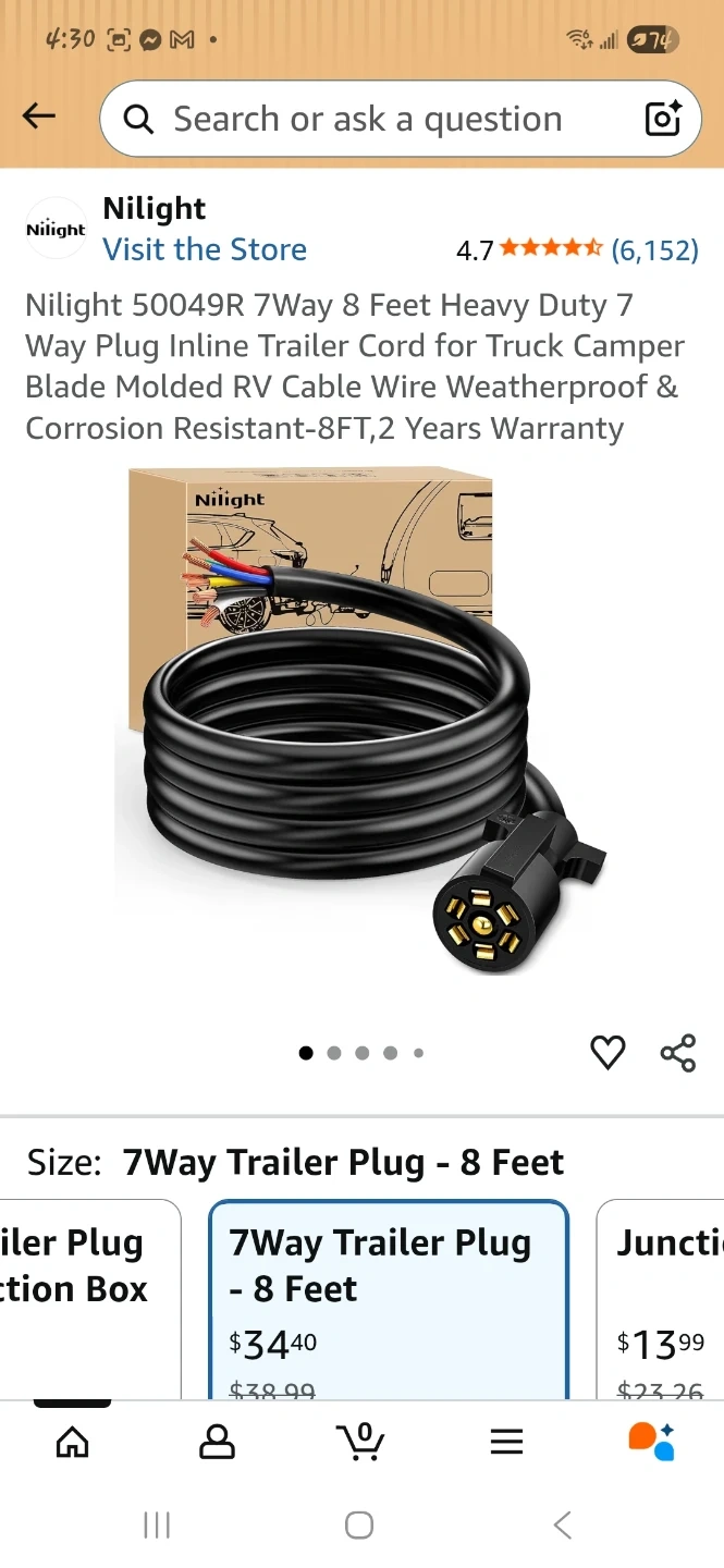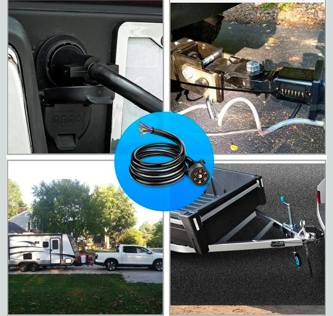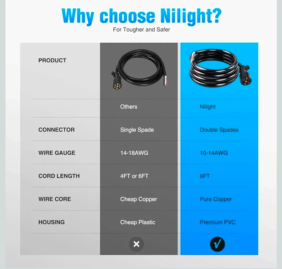 Selling a Nilight 50049R 7-Way Heavy Duty Trailer Plug Inline Trailer Cord. This is an 8-foot cable designed for truck campers and RVs. It's made with blade molded RV cable wire and is waterproof and corrosion resistant. The connector features double spades and uses pure copper wire cores with premium PVC housing for tougher and safer connections. The wires are color-coded for easy installation into a junction box.