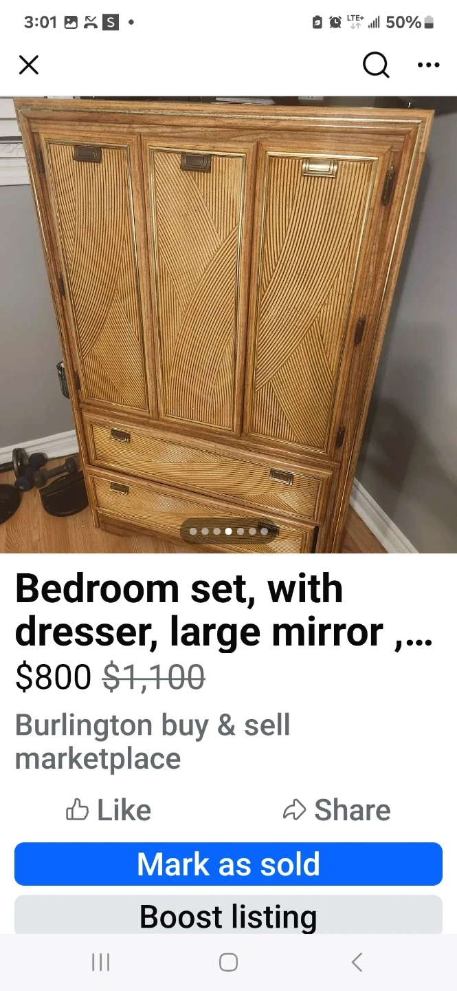Buy & SellBedroom setBedroom set$720Selling a bedroom set with a dresser and a large mirror. This set would look great in any bedroom!WHERE TO MEETCheck LocationView MapSELLERSharonRushdale181 review0 chats·1 favorites·39 viewsSEND CHAT TO SELLERHi Sharon! I’m interested in your listing.Hi Sharon! I’m interested in your listing.Get the Karrot app to chatSign In to chat