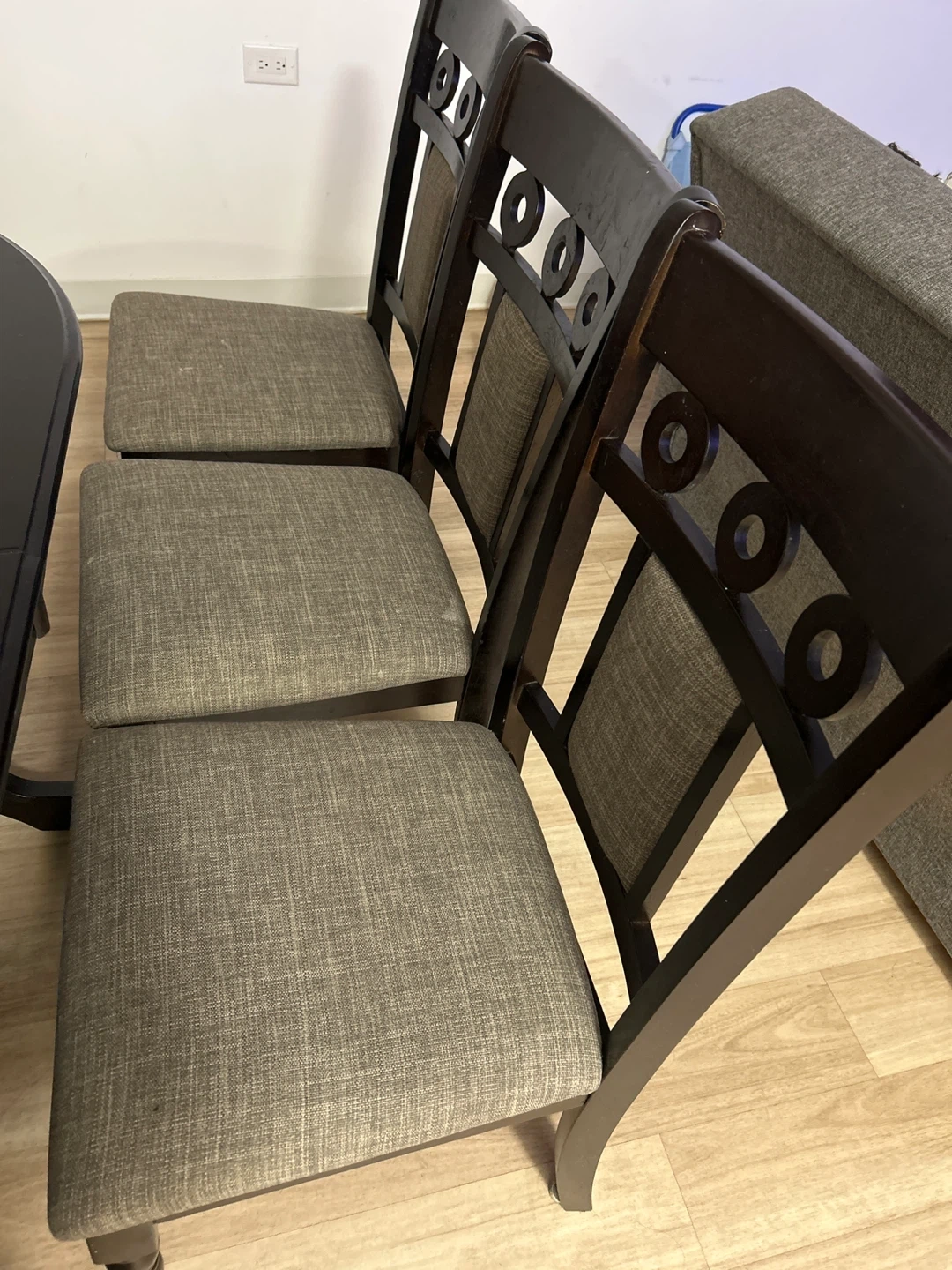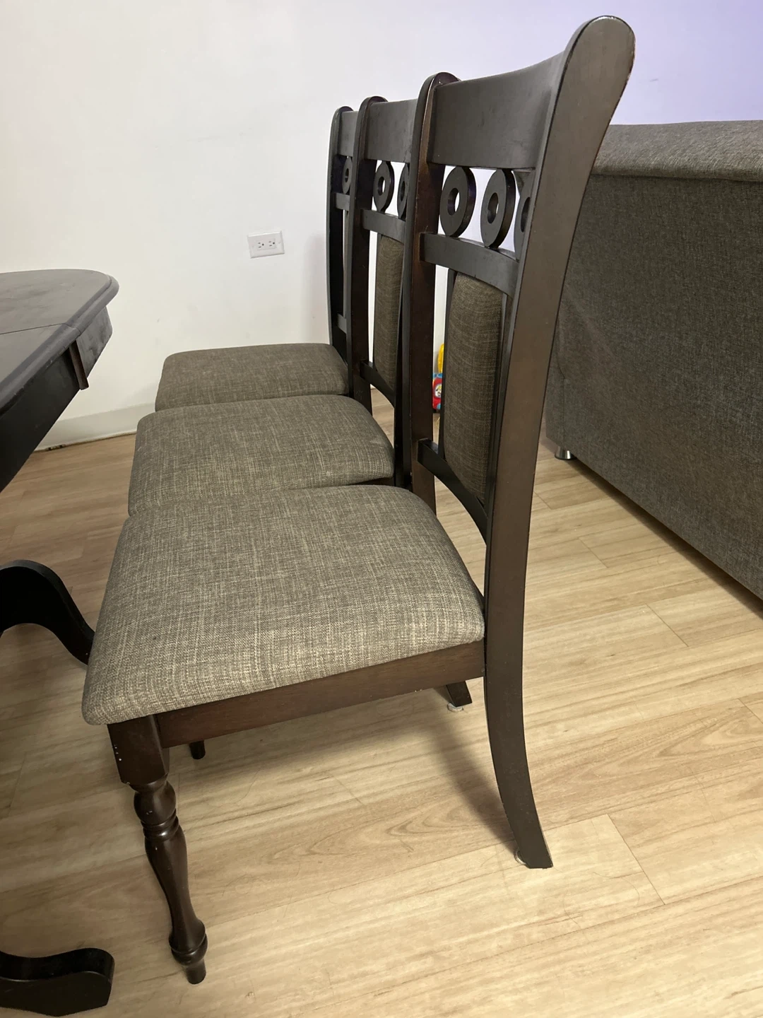 Selling a set of 3 dining chairs. They have a dark wood frame and neutral-colored fabric seats. Perfect for adding extra seating to your dining area!