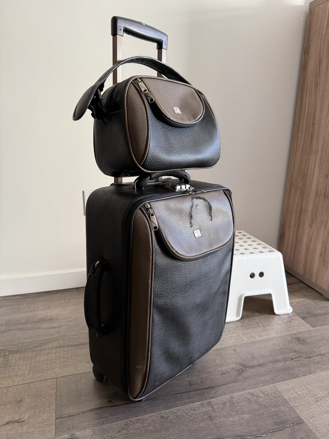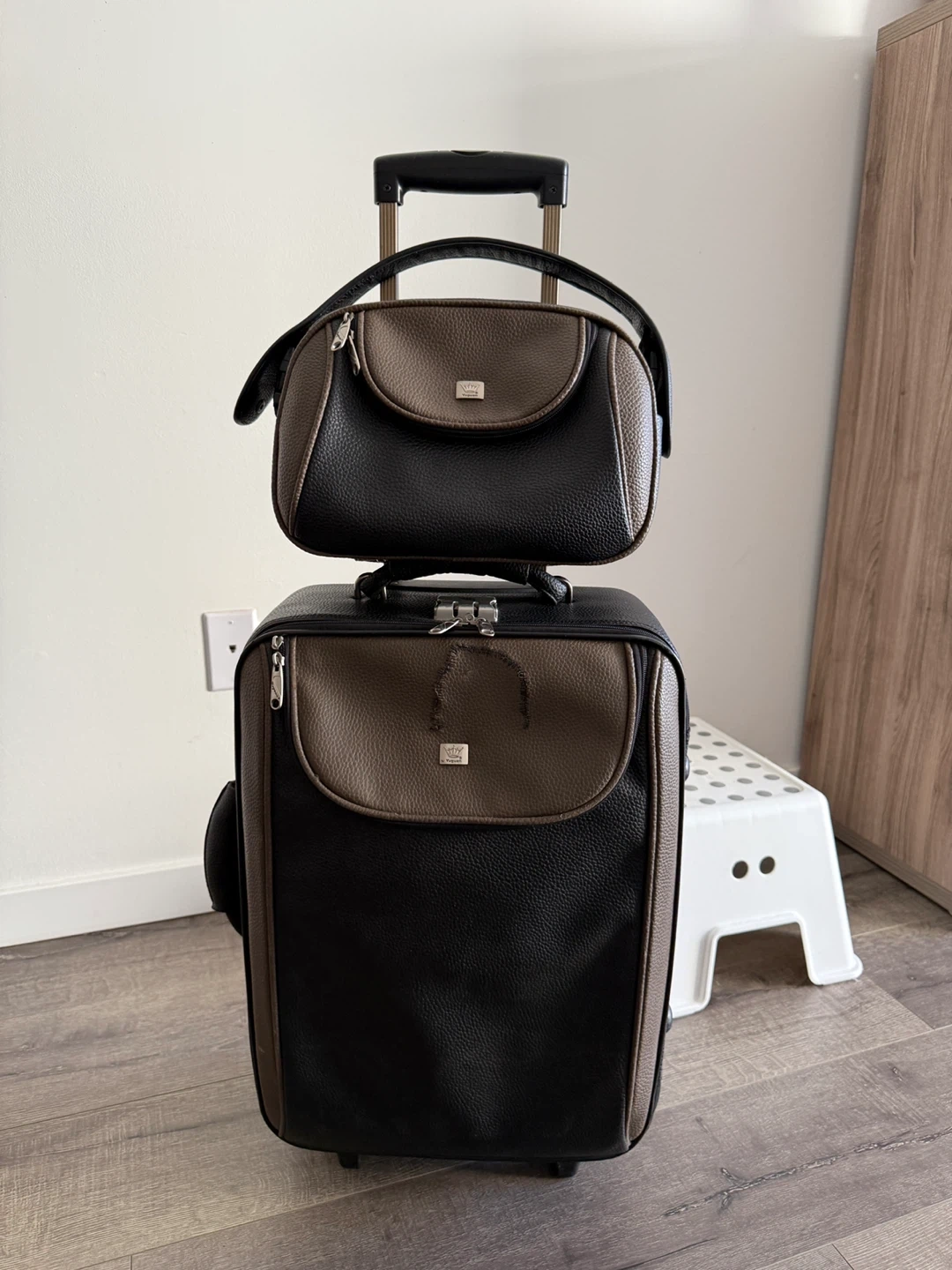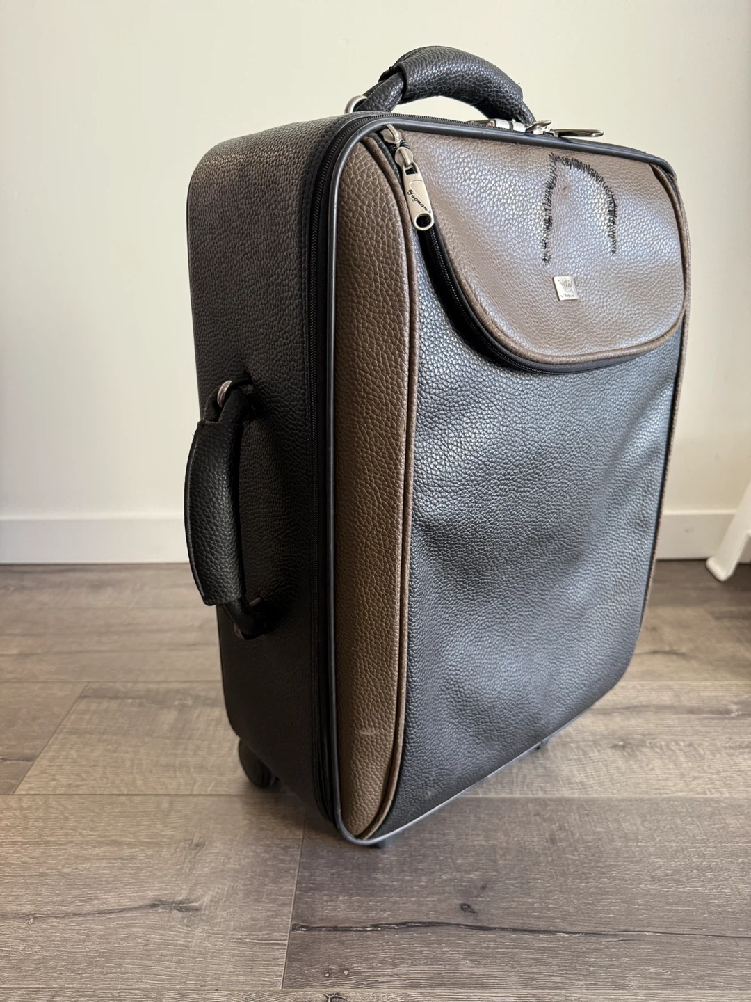 Selling a luxury real leather Verage rolling carry-on suitcase with a matching cosmetic bag. The set is in used condition, showing some wear on the suitcase. Perfect for travel!