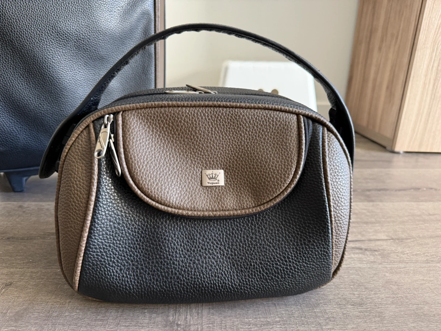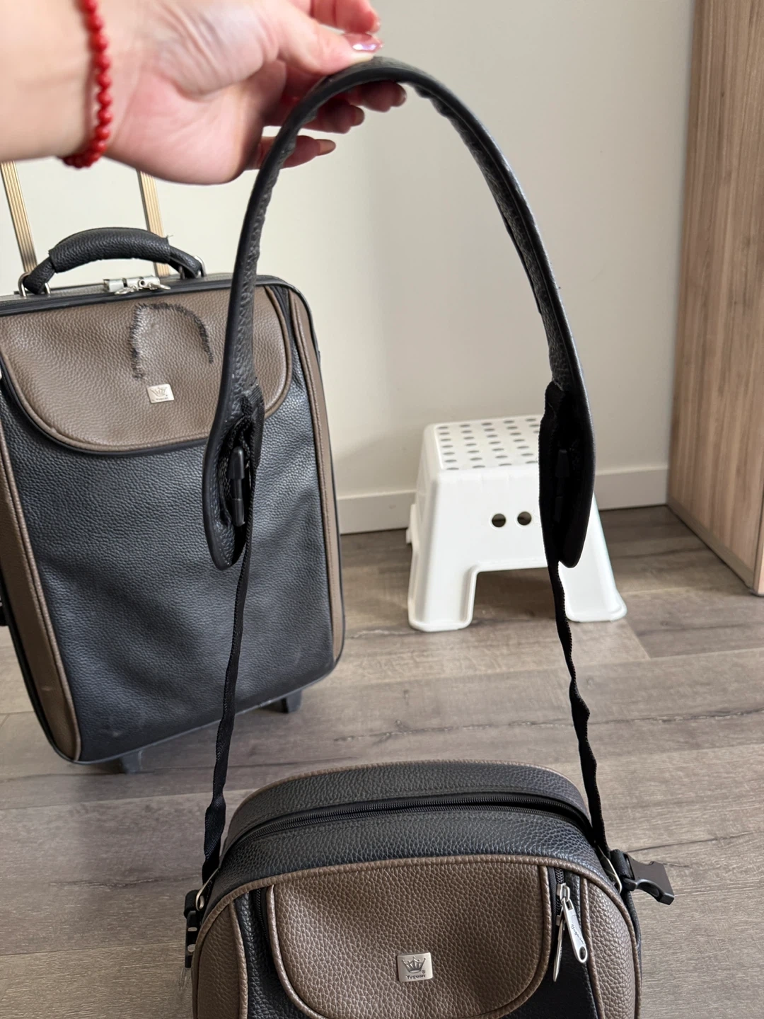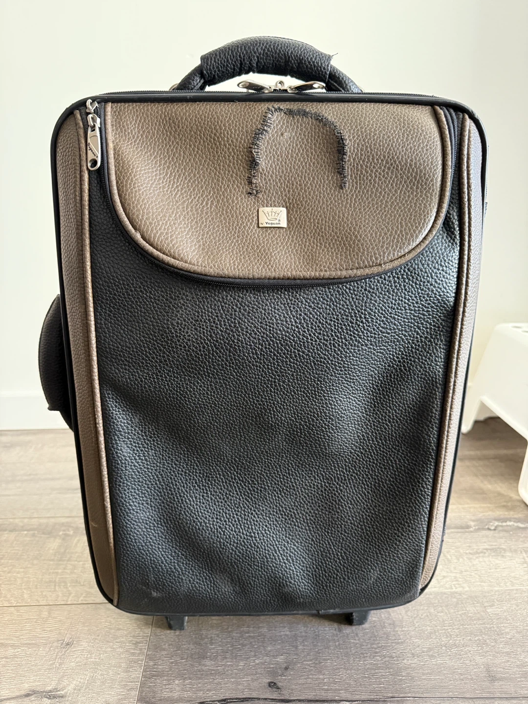 Selling a luxury real leather Verage rolling carry-on suitcase with a matching cosmetic bag. The set is in used condition, showing some wear on the suitcase. Perfect for travel!