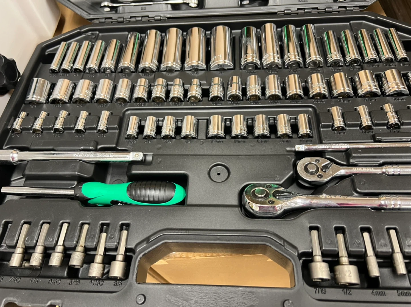 72 teeth 10mm Dry Blacket 152mm x 10mm drive extension, 10mm x 6mm adapter, 10mm drive universal joint, 16mm spark plug, 20 pieces of 10mm 6-point sockets (10, 11, 12, 13, 14, 15, 16, 17, 18, 19mm), 9 pieces of 10mm 6-point deep sockets (14, 15, 16, 17mm), 6mm drive 72 teeth ratchet, 19 pieces of 6mm 6-point pocket sockets (5, 6, 7, 8, 9, 10, 11, 12, 13, 14mm), 10 pieces of 6mm 6-point deep sockets (9, 10, 11, 12, 13 mm), 1 152mm x 6mm extension rod, 1 6mm universal joint, 6mm x 9.5mm adapter, 10 combination wrenches (10, 11, 13, 14, 15mm), 15 nut screwdriver bits (4, 5, 6, 7, 8mm), 28 matching/SAE hexagonal keys, 22 screwdrivers, 1 storage box