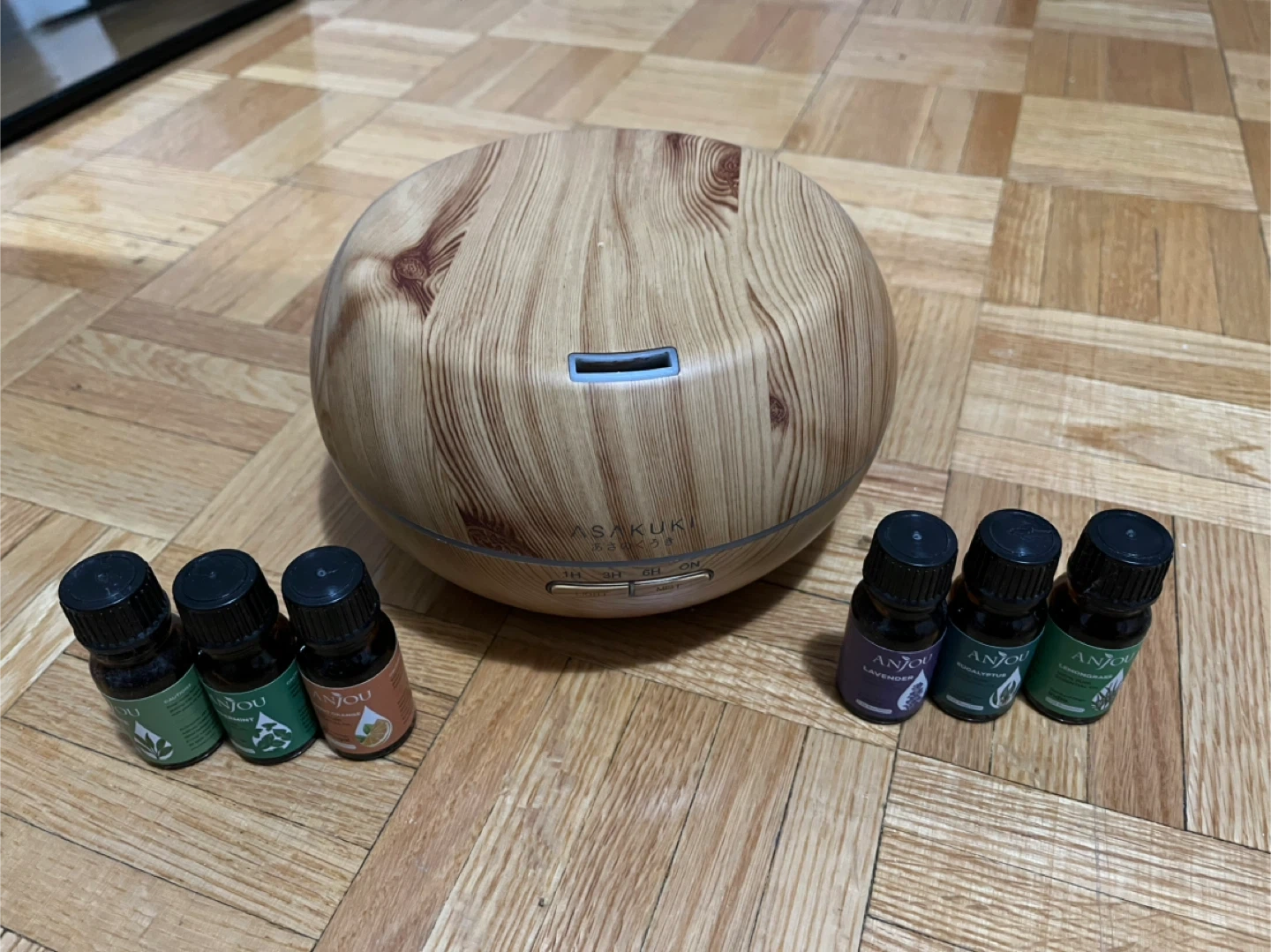 Selling an Asakuki diffuser with a wood grain design. It comes with a set of Anjou essential oils to get you started. The diffuser has settings for 1H, 3H, 6H, and On. Perfect for creating a relaxing atmosphere in your home