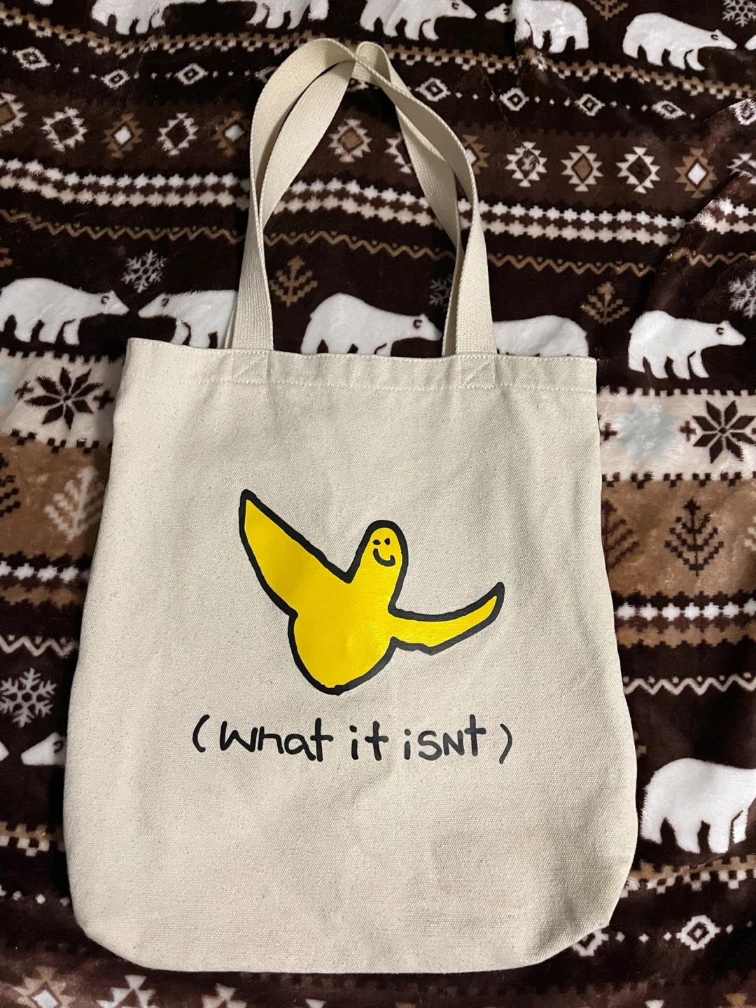 Tote bag with a unique design! It features a yellow bird graphic and the text '(what it isnt)' printed on the front. Perfect for carrying your everyday essentials.
