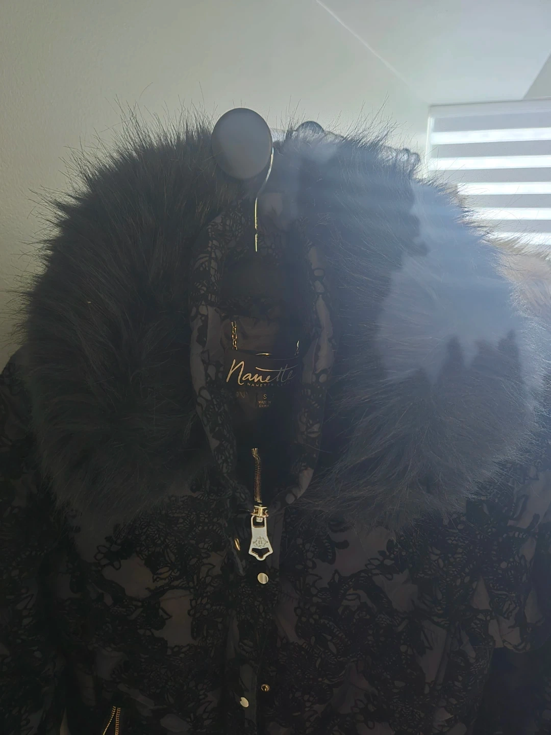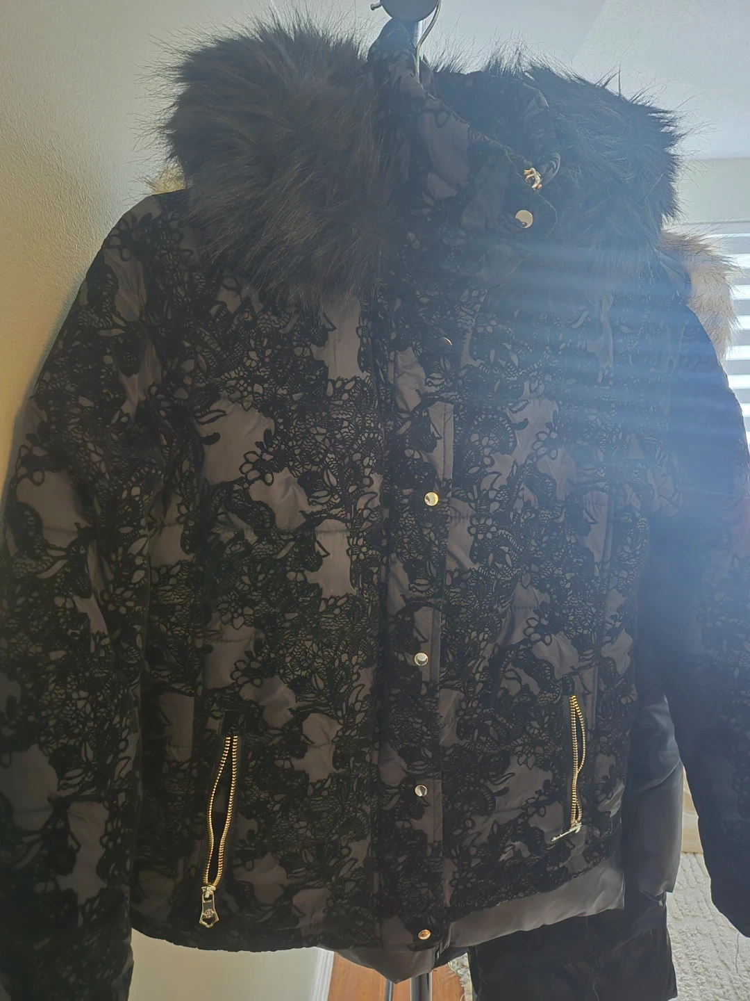Gorgeous black parka with fur hood, size small. Has a zip and snap closure with multiple pockets. Made of high quality material with floral lining. Fur trim around the hood is soft and fluffy. In excellent condition.