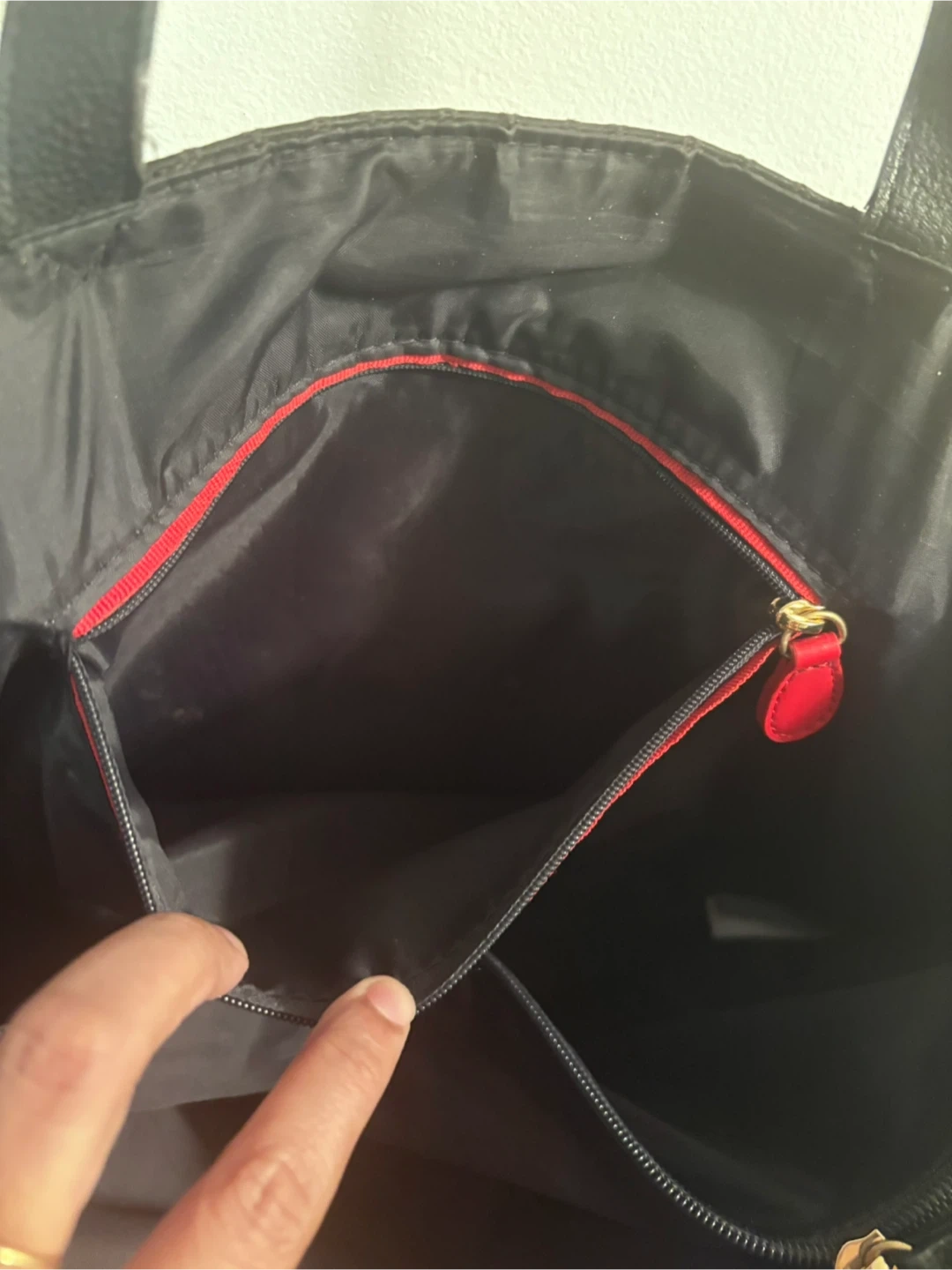 The interior has a red zipper pocket for added security and a stylish pop of colour
