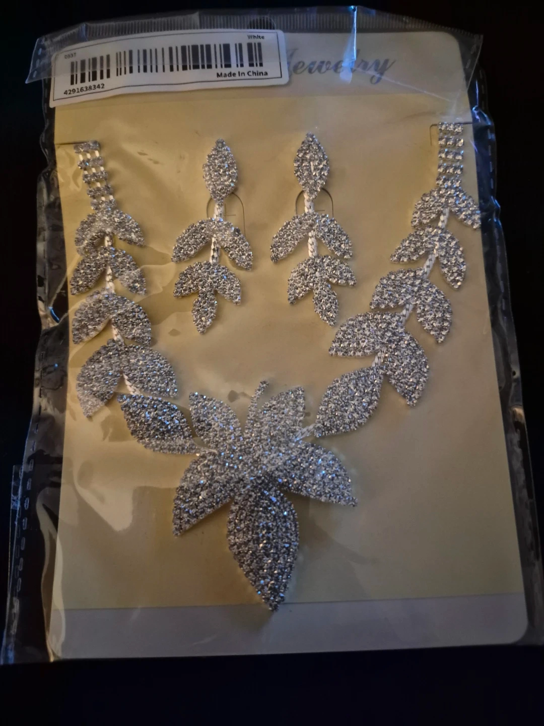 Brand new and still in packaging, this white rhinestone jewelry set is perfect for adding a touch of sparkle to any outfit! It includes a necklace and matching earrings, all adorned with beautiful rhinestones