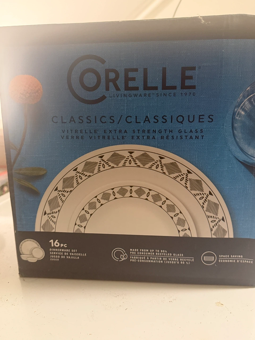 Selling a brand new Corelle Classics Cusco 16-piece dinnerware set! This set features Vitrelle extra strength glass and is made from up to 80% pre-consumer recycled glass. It's also designed to be space-saving, making it perfect for smaller kitchens or easy storage