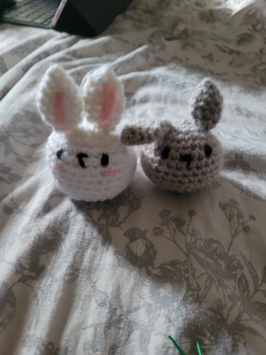 Selling a cute pair of handmade crochet bunnies! One is white and the other is grey. They're adorable and would make a lovely addition to any collection or a sweet gift for someone special