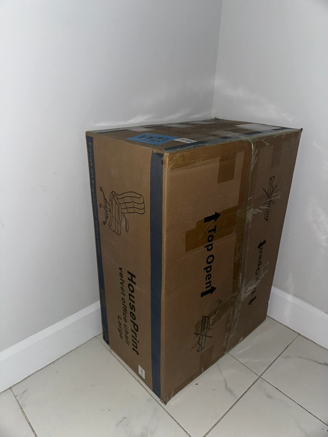 Selling a HousePrint velvet office chair in blue. It's a large size and comes in the original box. The chair features a comfortable velvet material and a stylish design. Dimensions are approximately 20" wide, 43-46.2" high, and 25.2" deep.