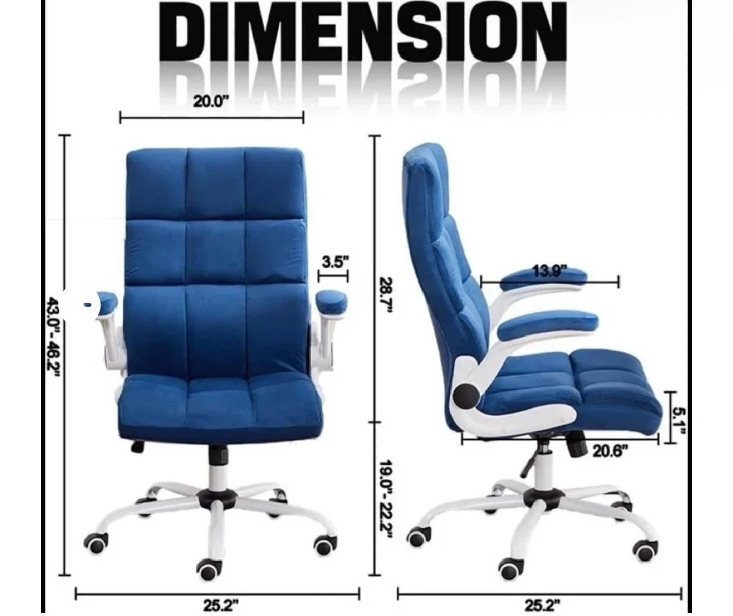 Selling a HousePrint velvet office chair in blue. It's a large size and comes in the original box. The chair features a comfortable velvet material and a stylish design. Dimensions are approximately 20" wide, 43-46.2" high, and 25.2" deep.