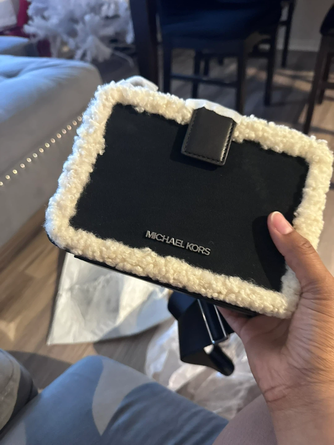 Never worn Selling a stylish Michael Kors shoulder bag! It features a chic black body with a cream-coloured, fluffy trim. Perfect for adding a touch of elegance to any outfit