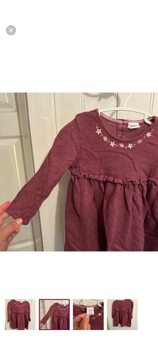 John Lewis brand. Long sleeve knit dress. Burgundy with floral embroidery neckline. Size 9/12m. Brand new condition