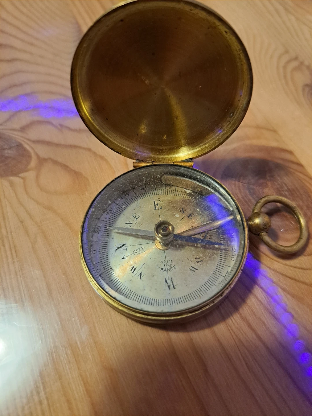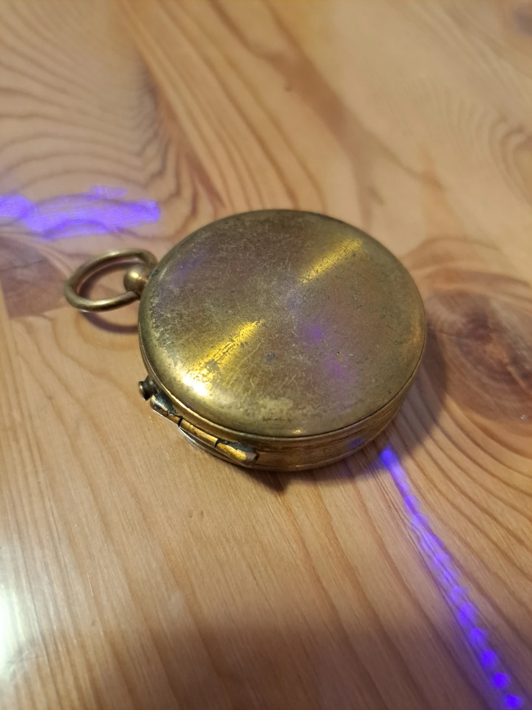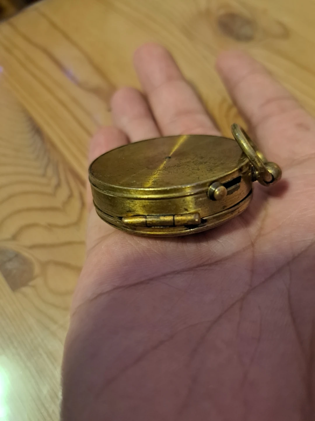 Selling a vintage brass pocket compass. It shows signs of wear, giving it a unique, antique look. The compass face is marked with directional indicators. A cool collectible item!