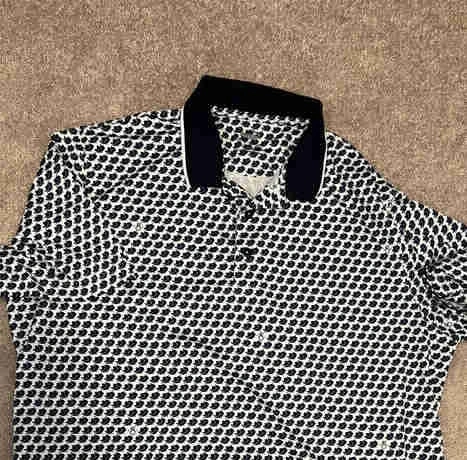 Elevate your golf game with this stylish, gently worn Puma polo shirt, perfect for a day on the green; it features a unique bird pattern on a white background and a dark blue collar. Here are some additional details: