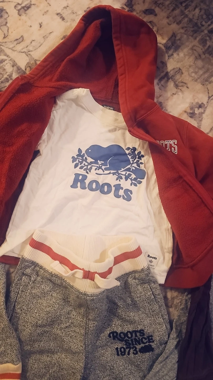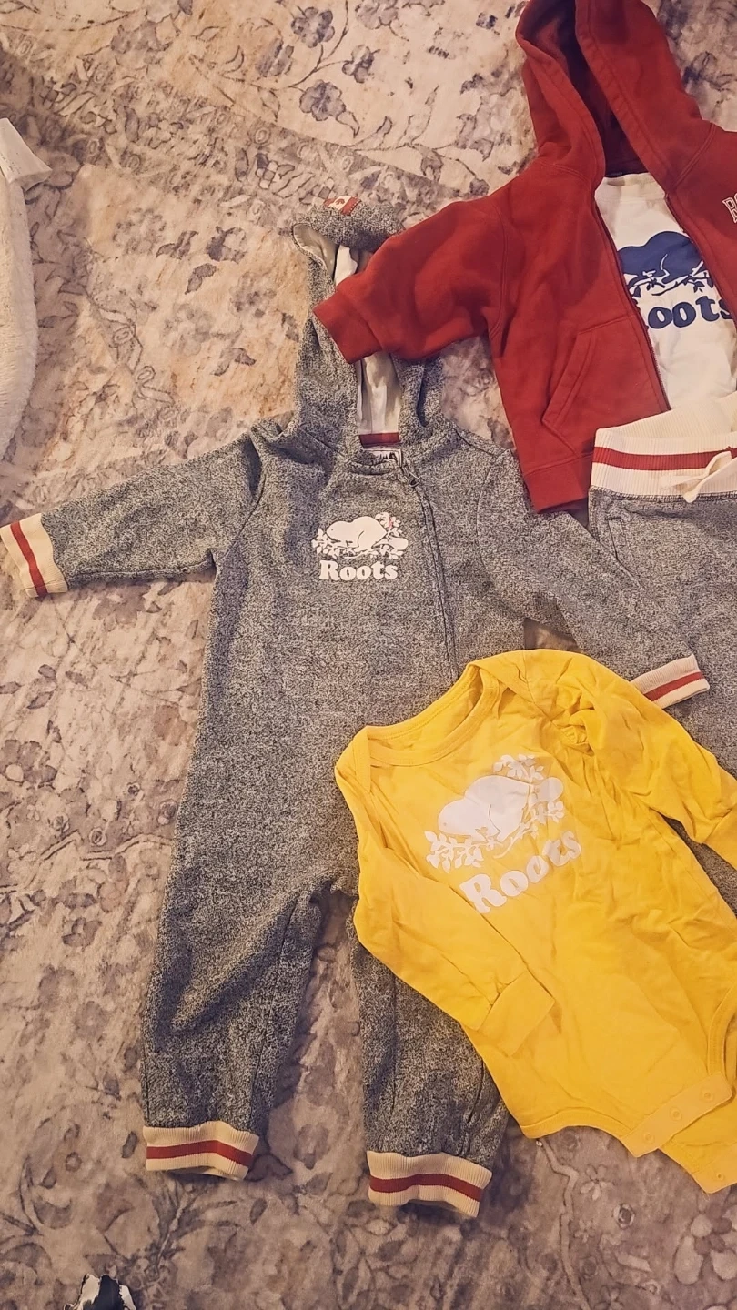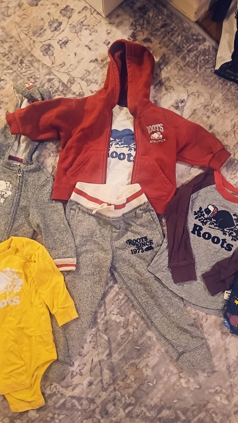 Selling a bundle of Roots baby clothes in size M (12m-3t). Includes a variety of items like a hoodie, t-shirts, pants, and a onesie. All items feature the classic Roots logo and designs! Great condition!