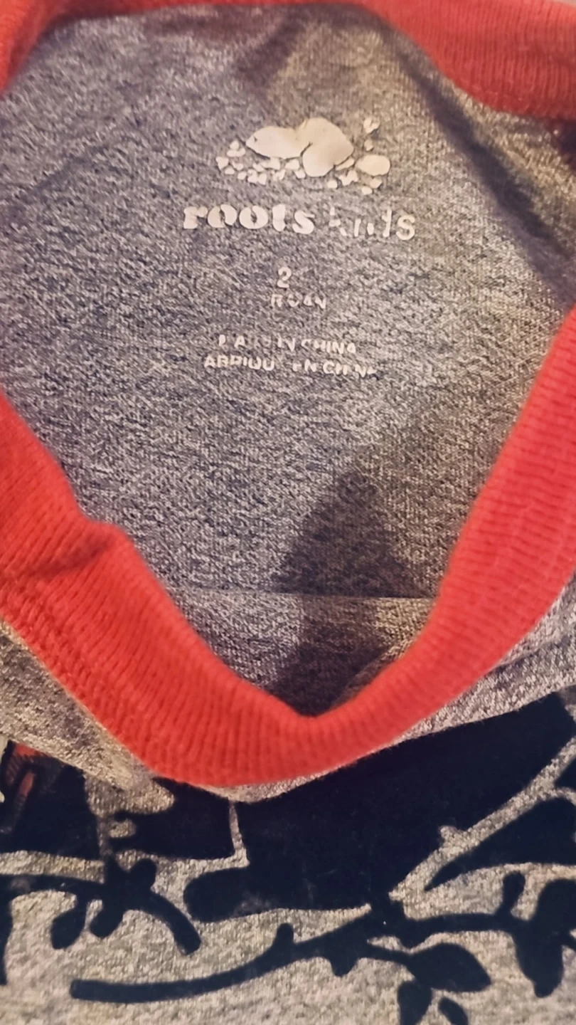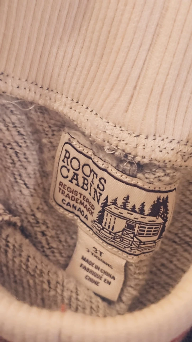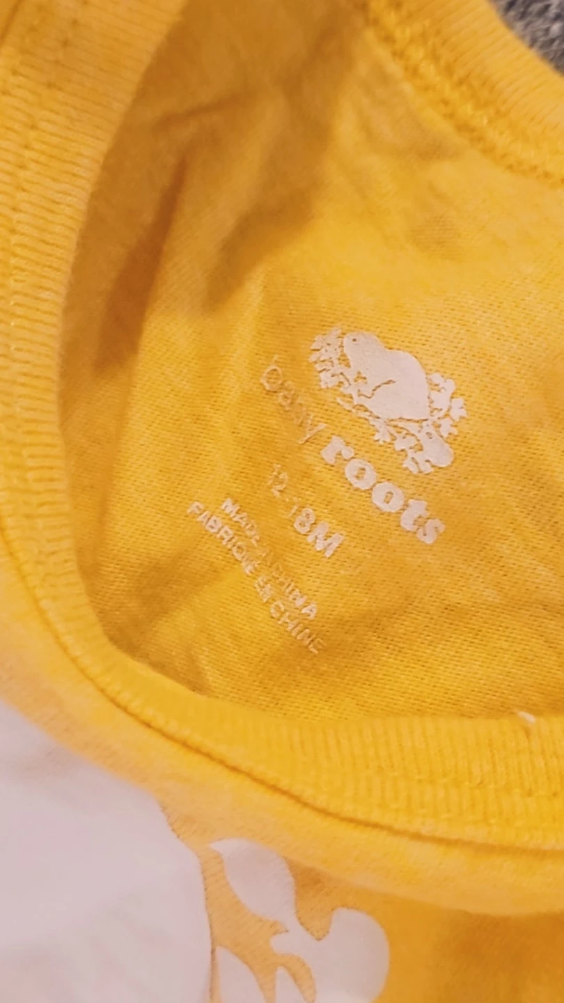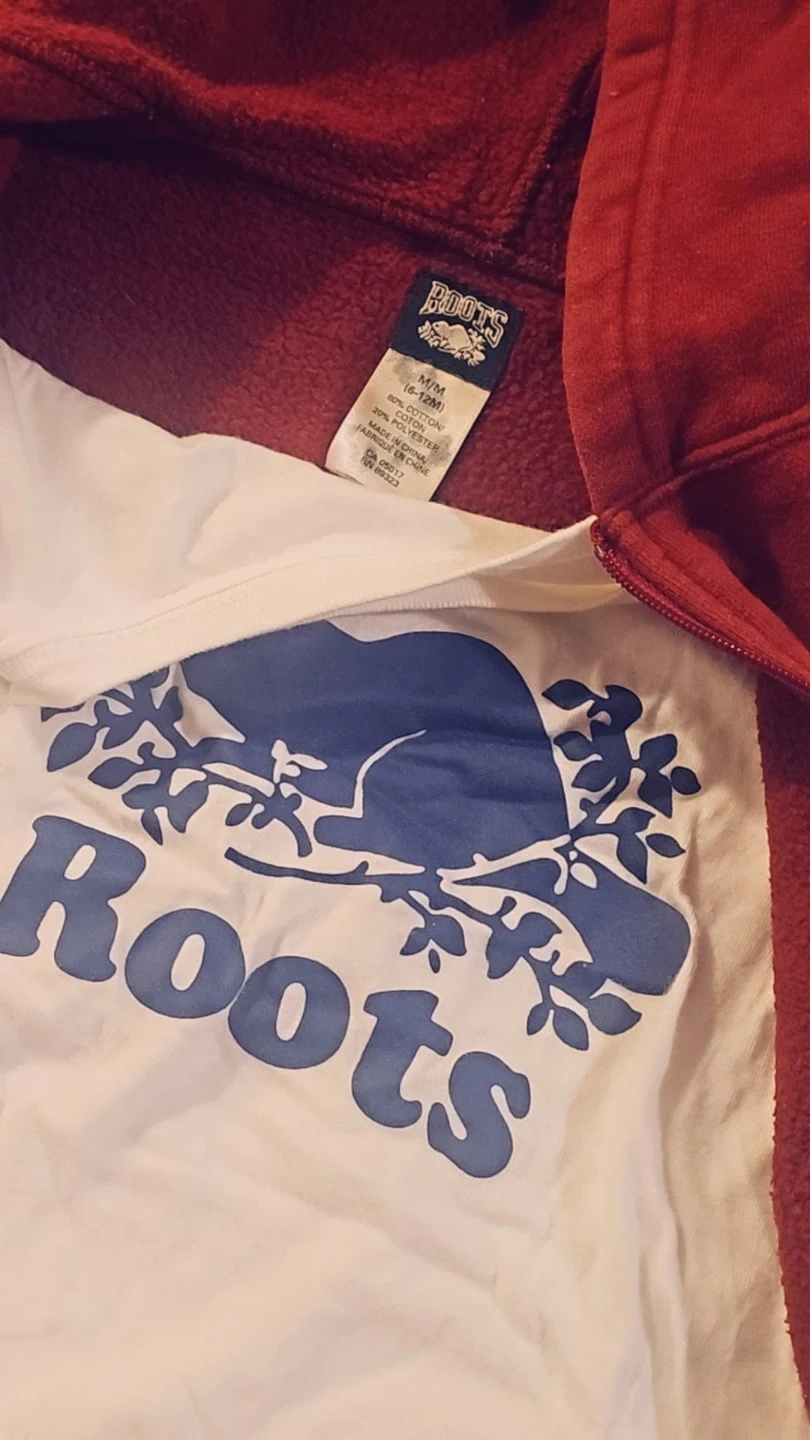 Selling a bundle of Roots baby clothes in size M (12m-3t). Includes a variety of items like a hoodie, t-shirts, pants, and a onesie. All items feature the classic Roots logo and designs! Great condition!
