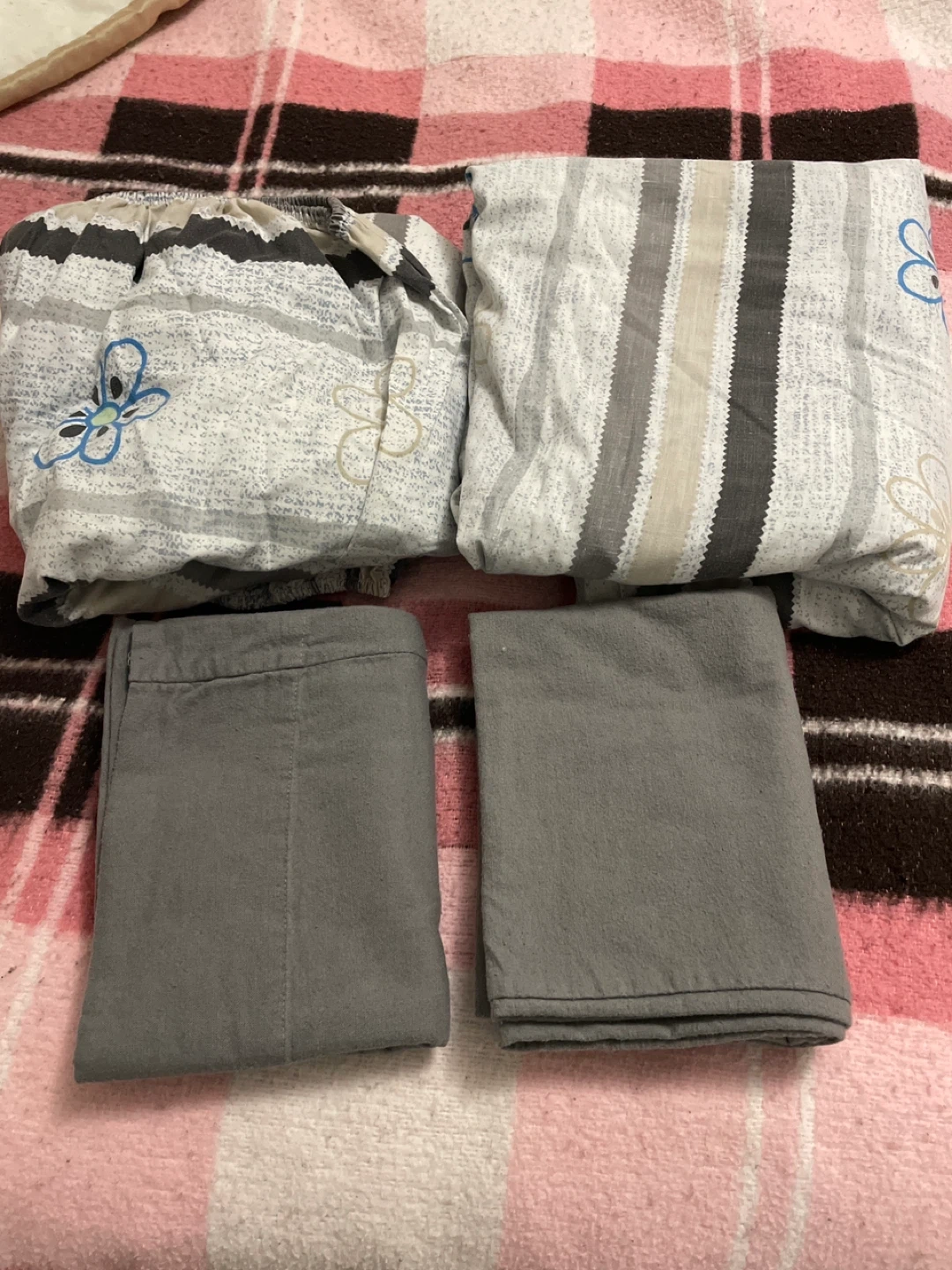 Selling a Queen size bedding set like new ! The set includes a fitted sheet, a flat sheet, and pillowcases. It's made of 50% cotton and 50% polyester. Machine wash separately in cold water. Do not bleach. Tumble dry at low temperature. Remove promptly. Fold immediately when dry. Fold may require touch up ironing