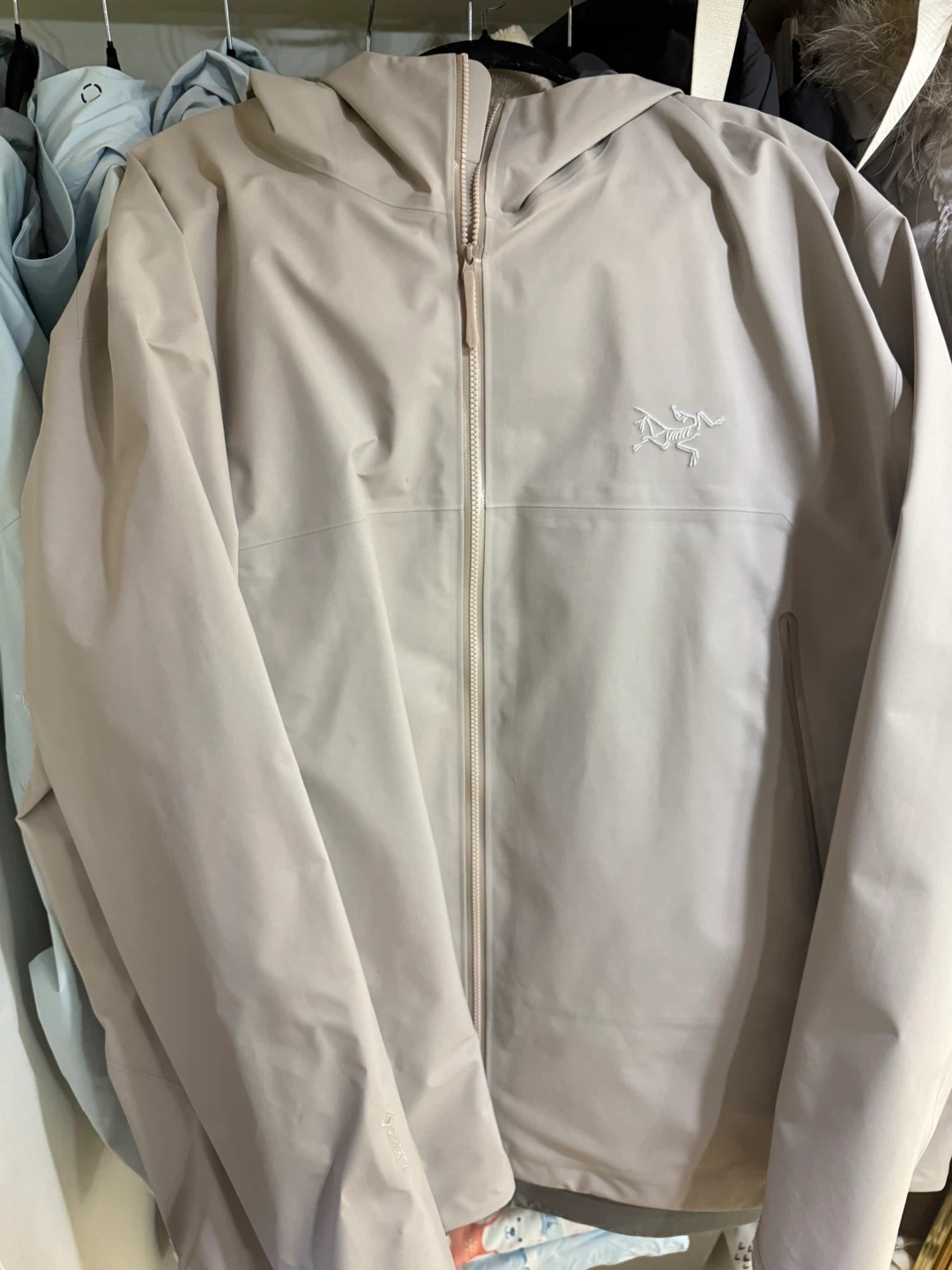 Selling a beige Arc'teryx hooded jacket! It's in great condition and ready for the cooler weather. Perfect for layering or wearing on its own