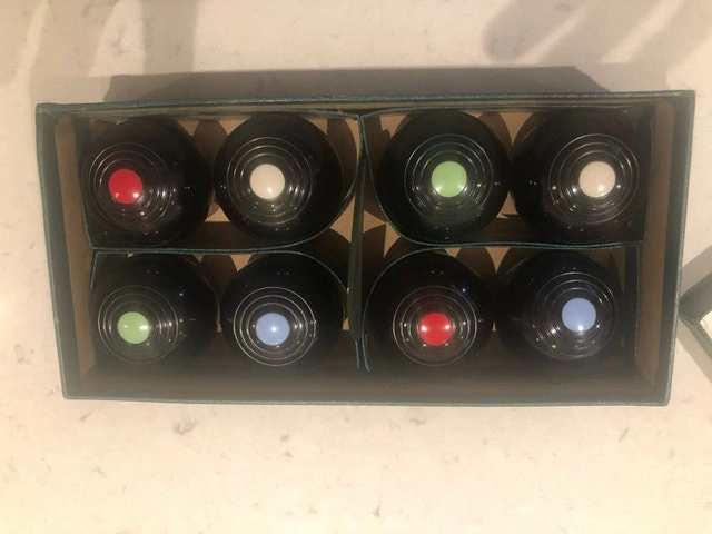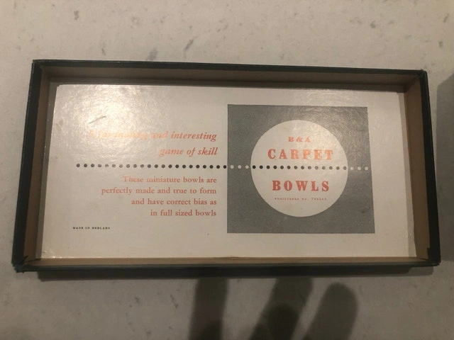 Get ready to roll with this charming set of B&A Carpet bowling set! This set of eight miniature balls comes with its original box, adding a touch of vintage flair to your indoor games. This set is used, and I'd estimate it to be from the 1970's and from England. It has a missing jack (white ball) but it can easily be replaced. If this ad is still up, then yes, the item is still available. Price is negotiable.