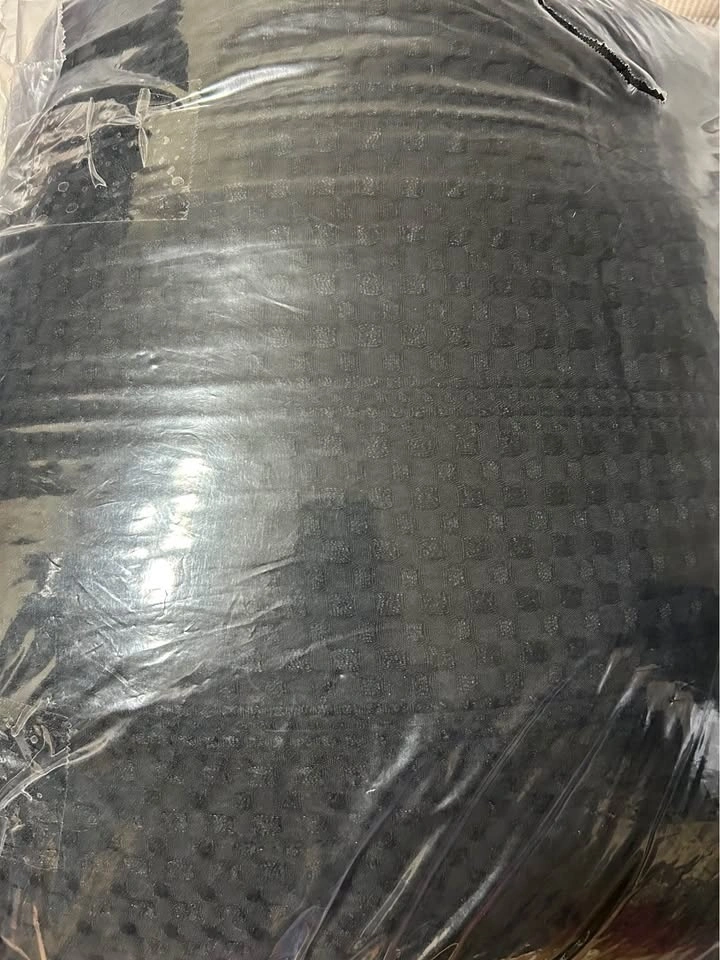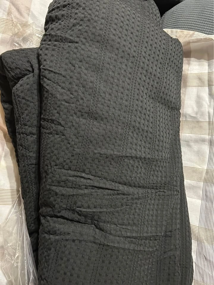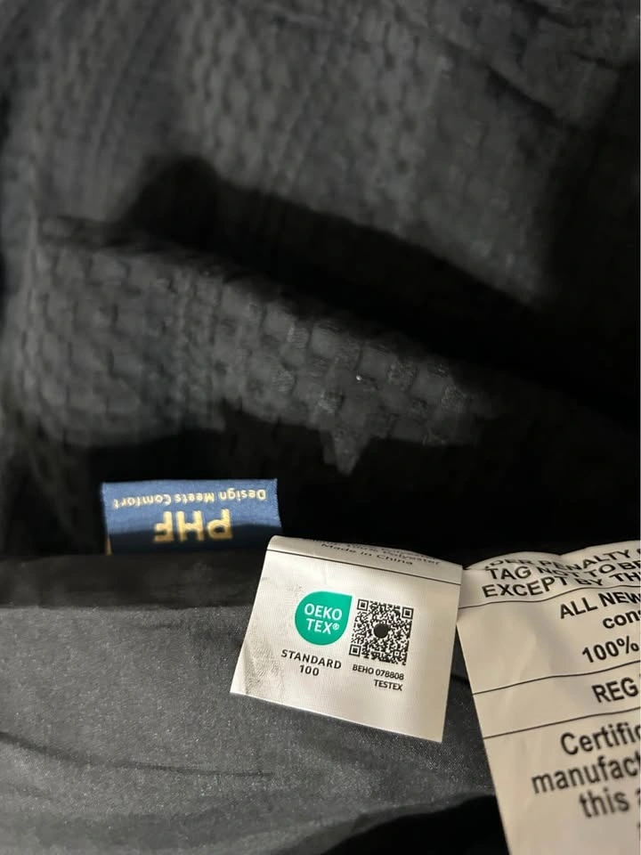 This is a brand new PHF heavyweight black waffle weave comforter set. The material is 100% polyester. King bedding set includes 1 comforter 104" x 90", 2 pillow shams 20" x 36", fits King sizes bed .It features a timeless classic design and is made with 100% recycled polyester, a cotton-like fabric blending environmental responsibility with everyday comfort!