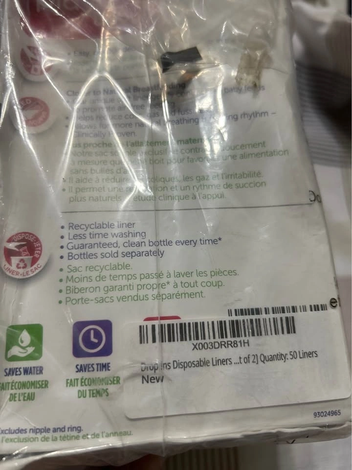 Selling a new pack of Playtex Baby Nurser Drop-Ins Liners 4oz(118mL)! These are disposable liners for baby bottles that make cleanup easy and reduce air intake for gas-free feeding. Each liner is pre-sterilized and made with recyclable materials. The pack contains 100 liners!