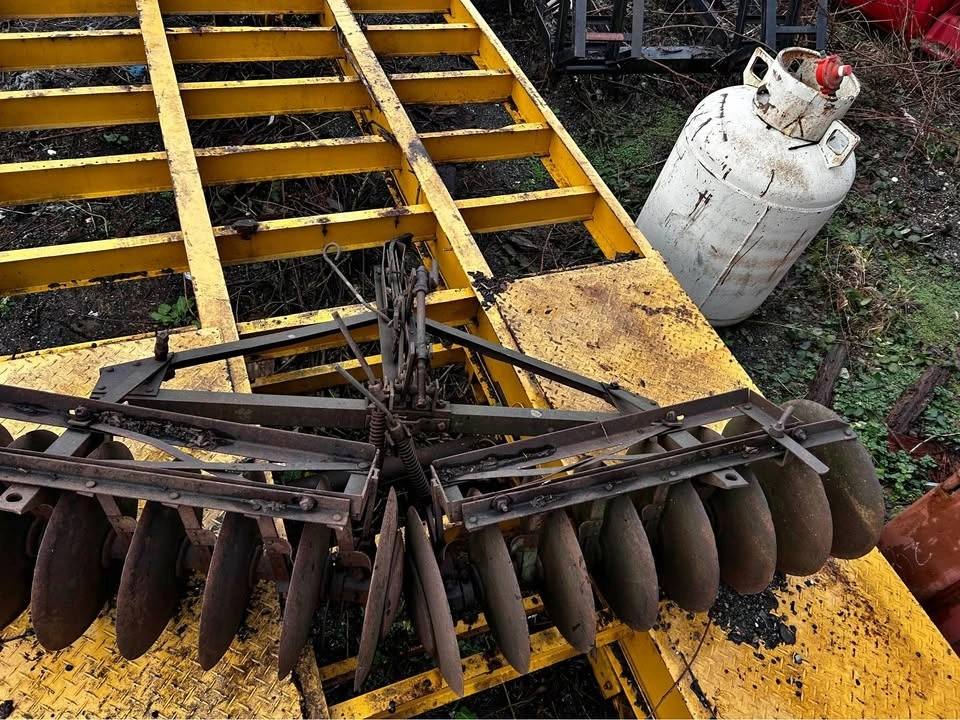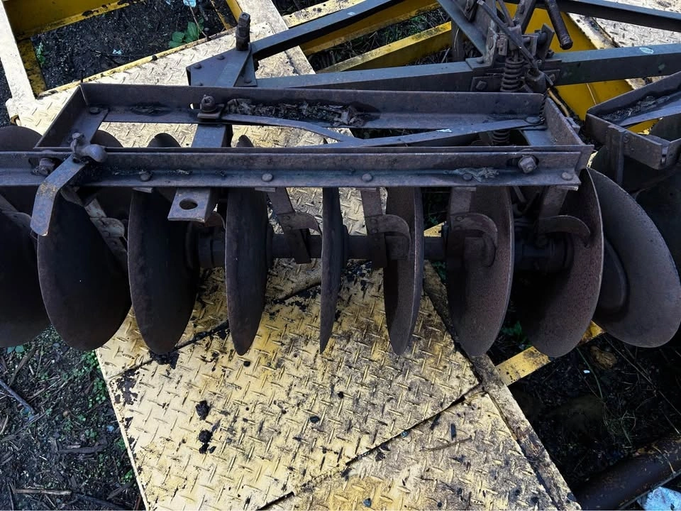 Vintage disc harrow, approximately 8 feet wide. Perfect for yard art, rustic décor, farm display, or as a source of quality steel for knife making and metal projects.