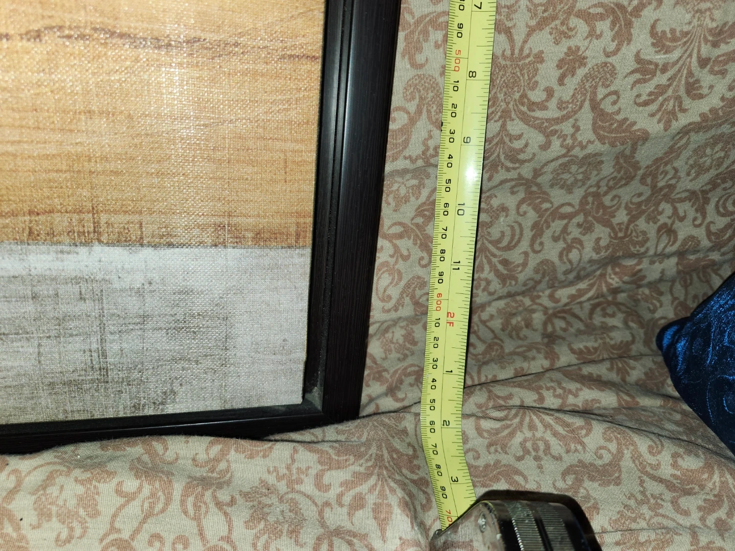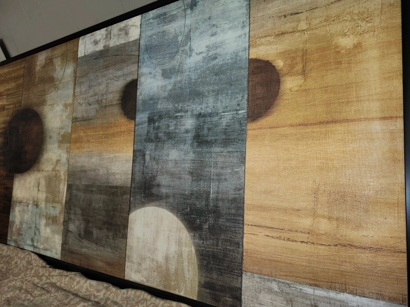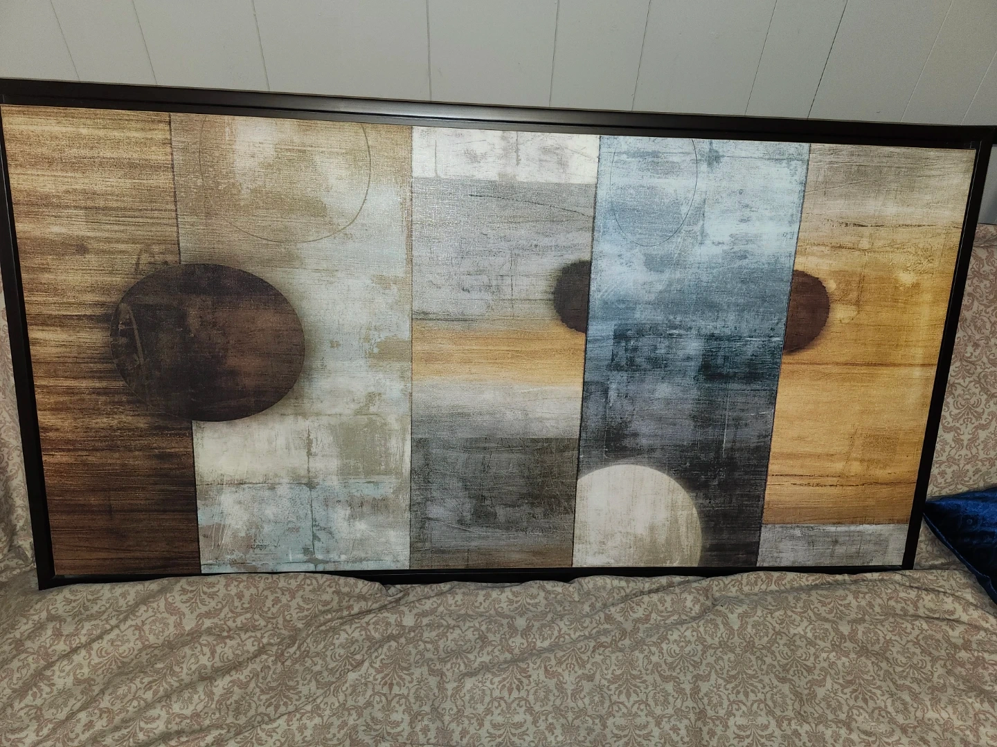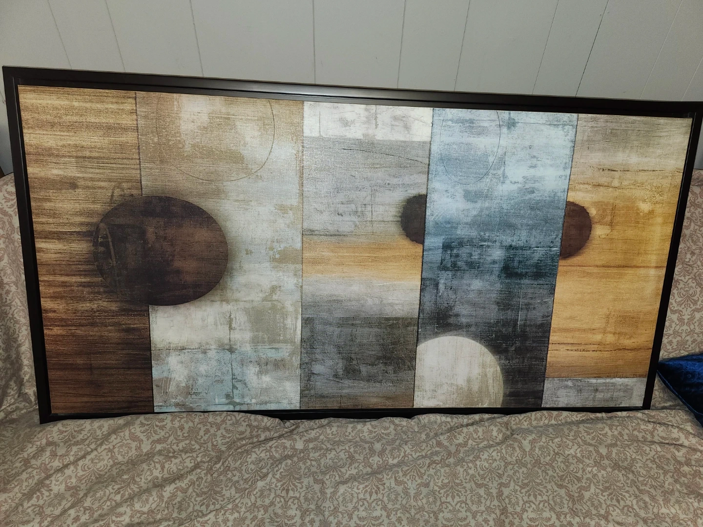 Selling a large piece of abstract wall art. It measures approximately 4 ft by 2 ft. The artwork features a blend of neutral tones with blue, brown, and grey accents. It's framed and ready to hang to add a modern touch to your space