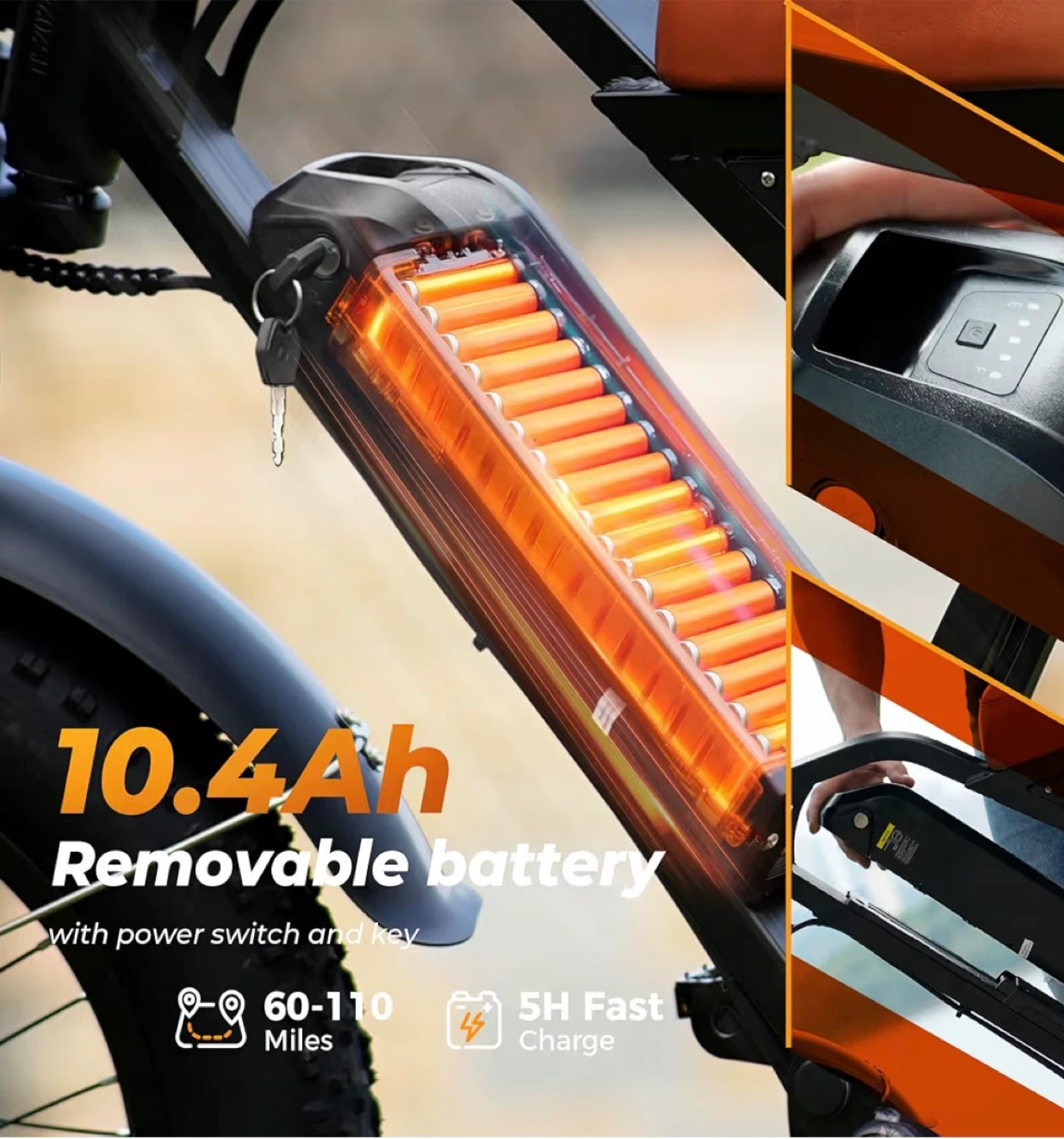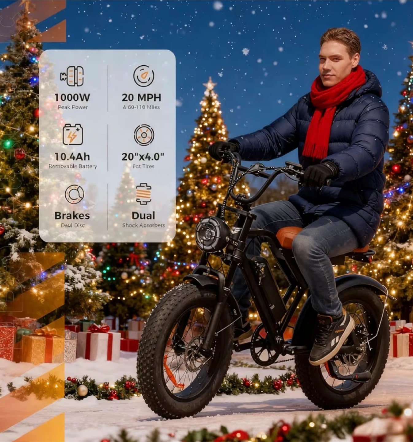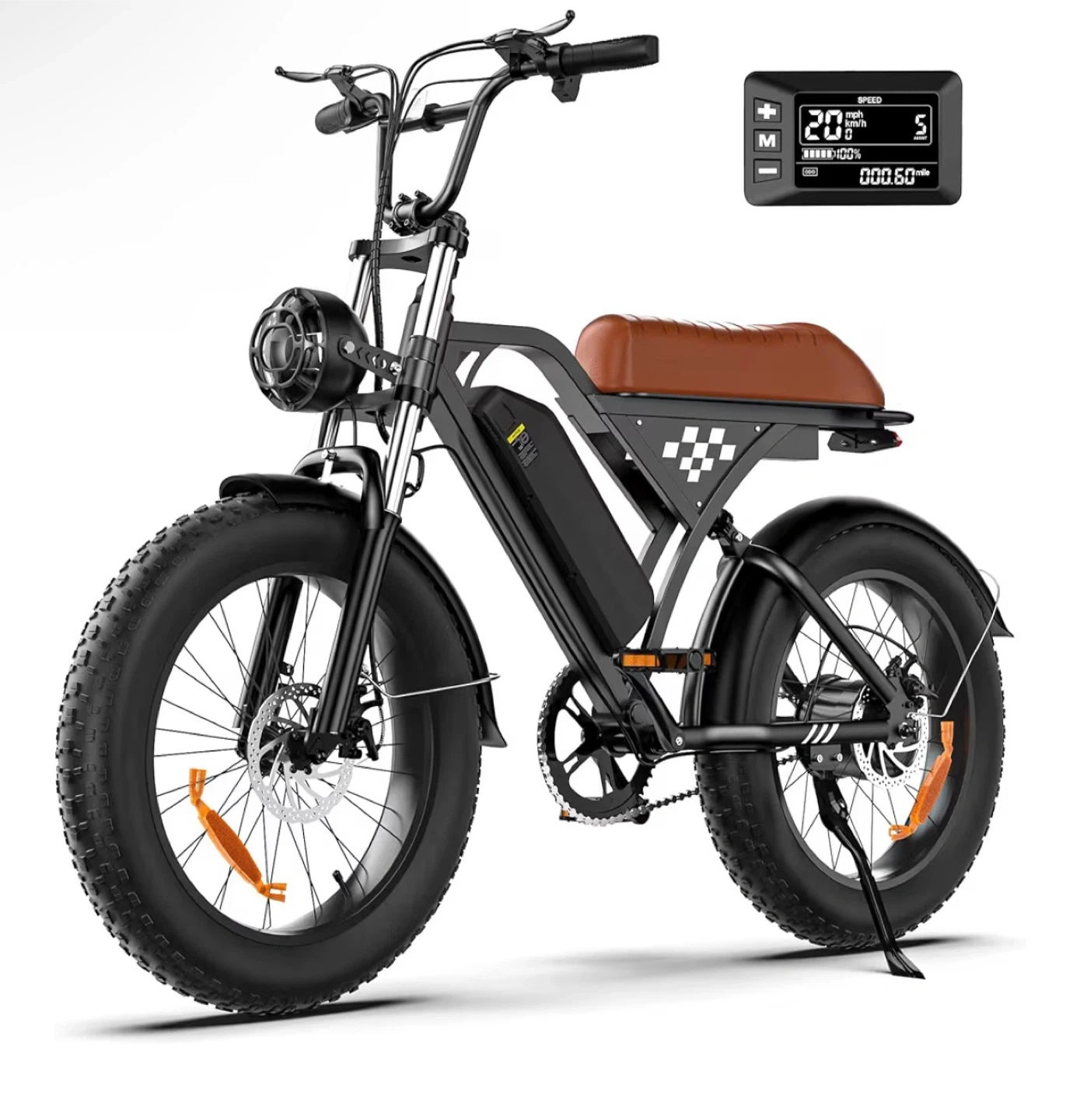 Selling a fat tire dirt bike with 20"x4.0" tires! It features a 1000W peak motor, reaching speeds of up to 20 MPH. The removable 10.4Ah battery provides a range of 60-110 miles. It also has dual disc brakes and dual shock absorbers for a smooth ride