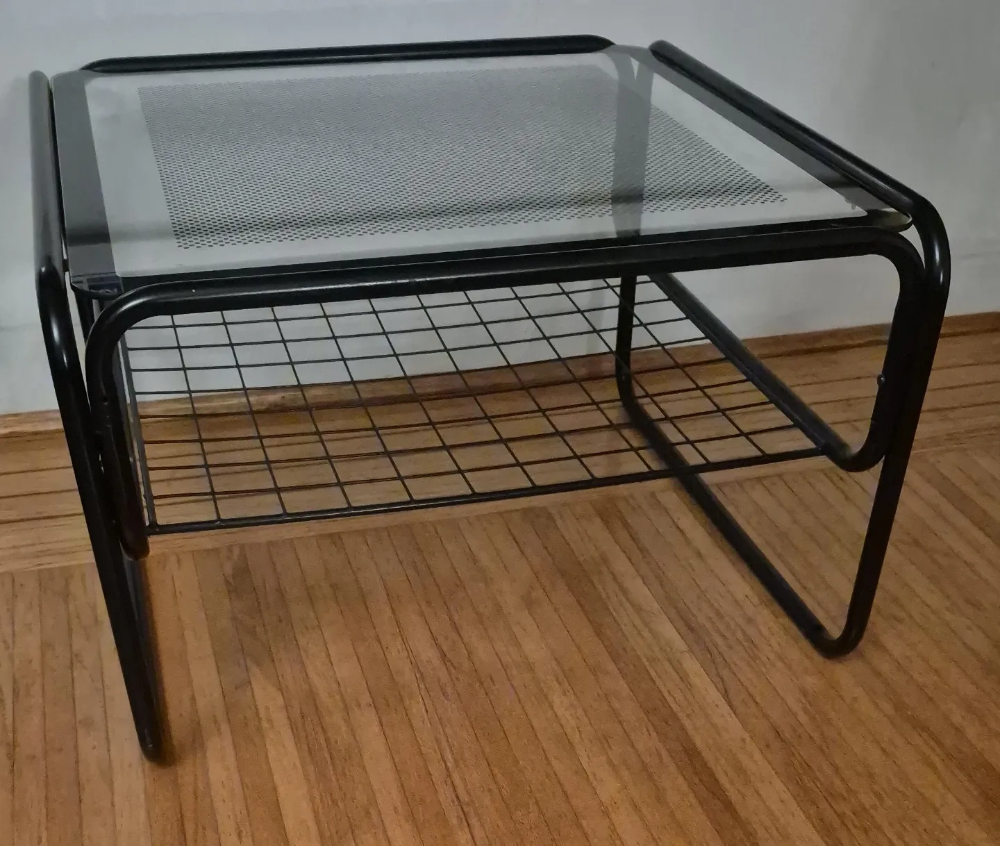 Selling a stylish side table featuring a black metal frame and a glass top. It has a minimalist design that would fit well in any living room or bedroom. The table also includes a lower shelf for extra storage or display