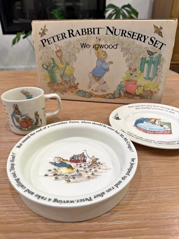Brand new Wedgwood Peter Rabbit Nursery Set, featuring classic illustrations from Beatrix Potter’s Peter Rabbit stories. This charming children’s set is beautifully made and comes new in the original Wedgwood box, making it ideal as a gift or collectible.