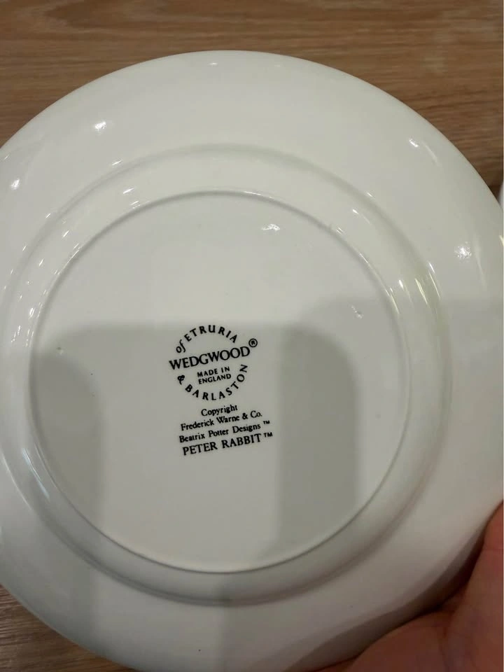 Decorated with beloved Peter Rabbit scenes and story text around the rims, showcasing Wedgwood’s high-quality craftsmanship and timeless design.