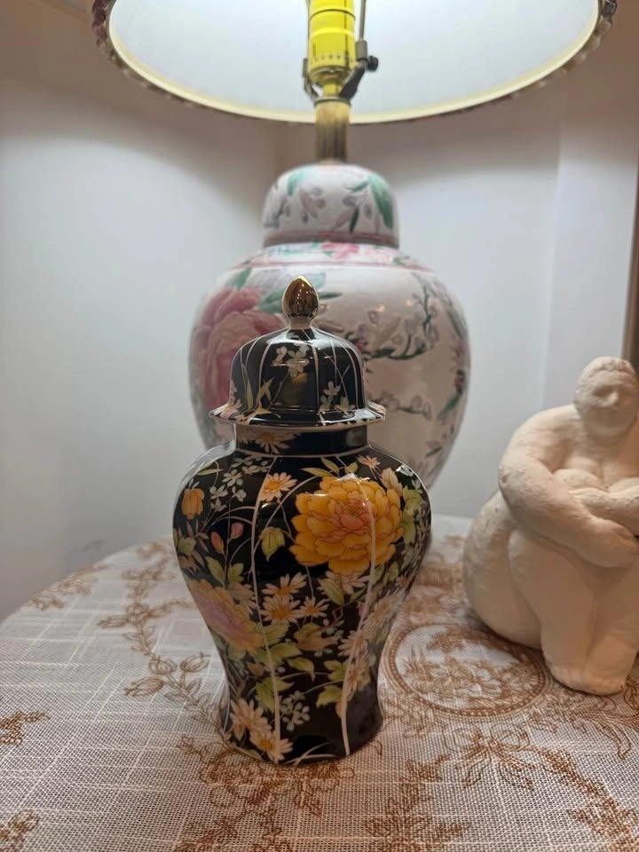 Beautiful hand-painted porcelain jar featuring a rich black ground with delicate floral motifs in yellow, white, and soft green tones. The fine brushwork and vibrant colors create a classic, timeless look. Finished with a matching lid and a gilded finial on top, adding an elegant touch.