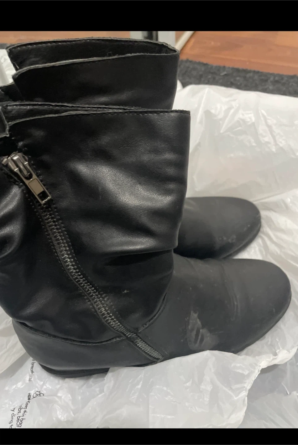 Selling a pair of black ankle boots. They have a zipper detail on the side. There are some signs of wear, as shown in the pictures, but they're still in good condition for everyday wear!