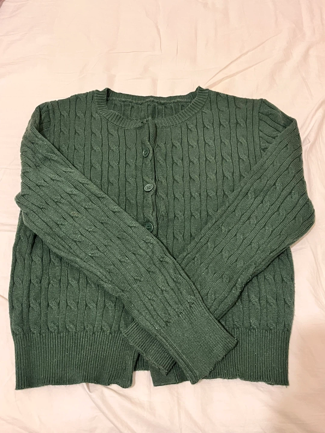 Selling a cozy green cable knit cardigan! It's in great condition and perfect for layering during the cooler months. The knit pattern adds a classic touch to any outfit. It's a versatile piece that can be dressed up or down!