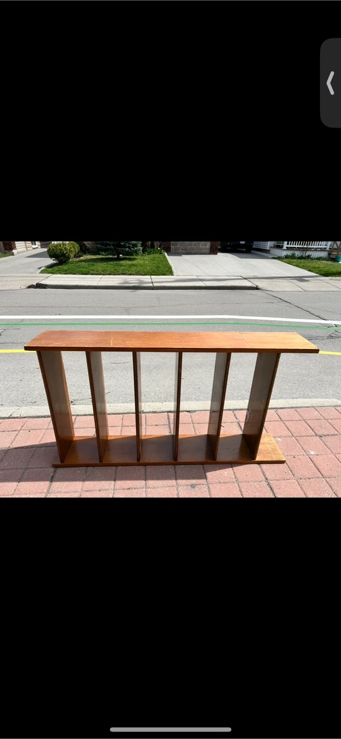 Here's a wooden console table in good condition. It features an interesting design with vertical dividers, perfect for adding a unique touch to your entryway or living room