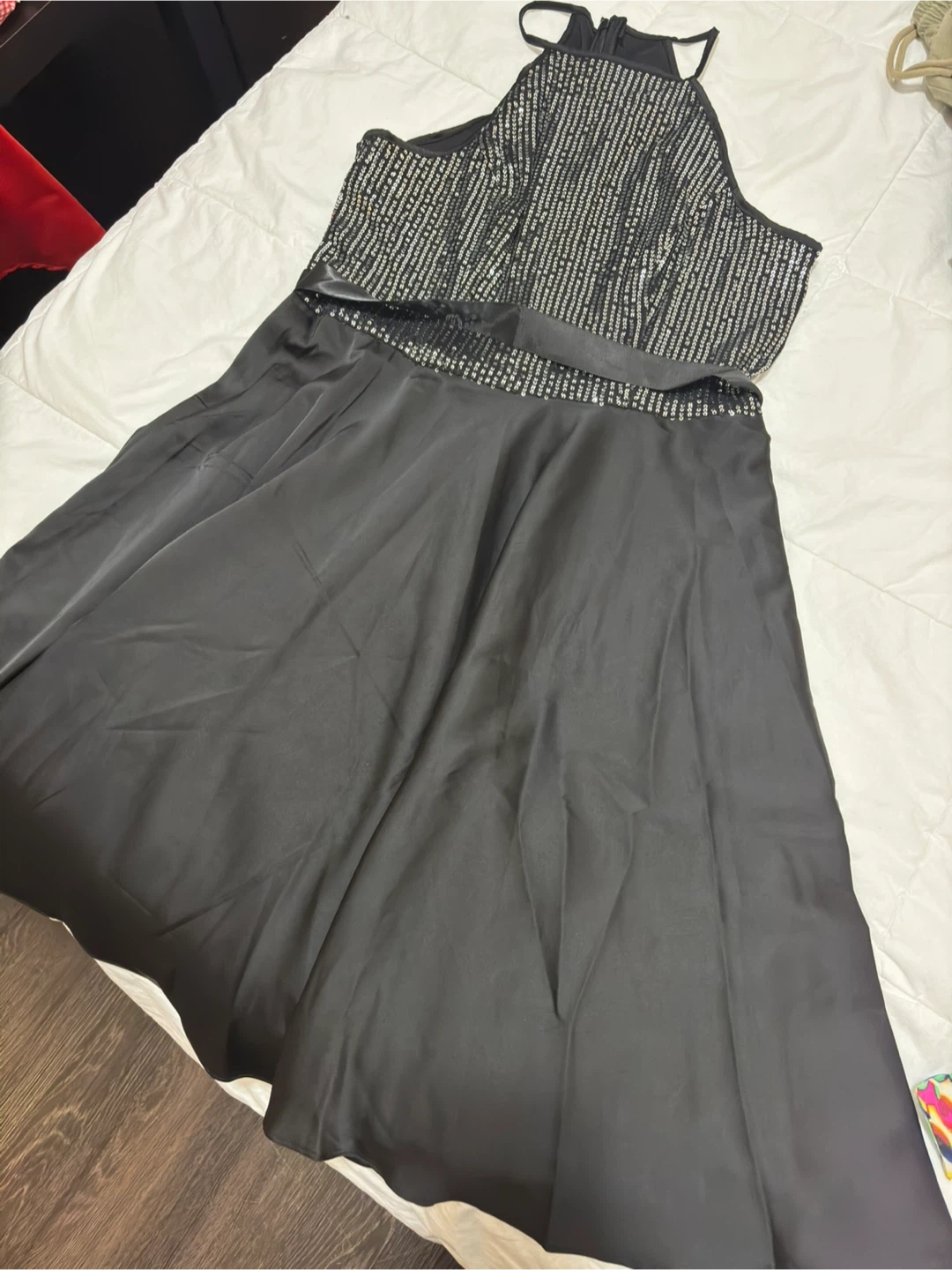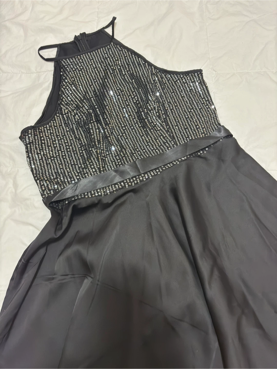 Selling a lovely black halter dress! The top portion features a sparkly design, adding a touch of elegance. Perfect for a special occasion or a night out