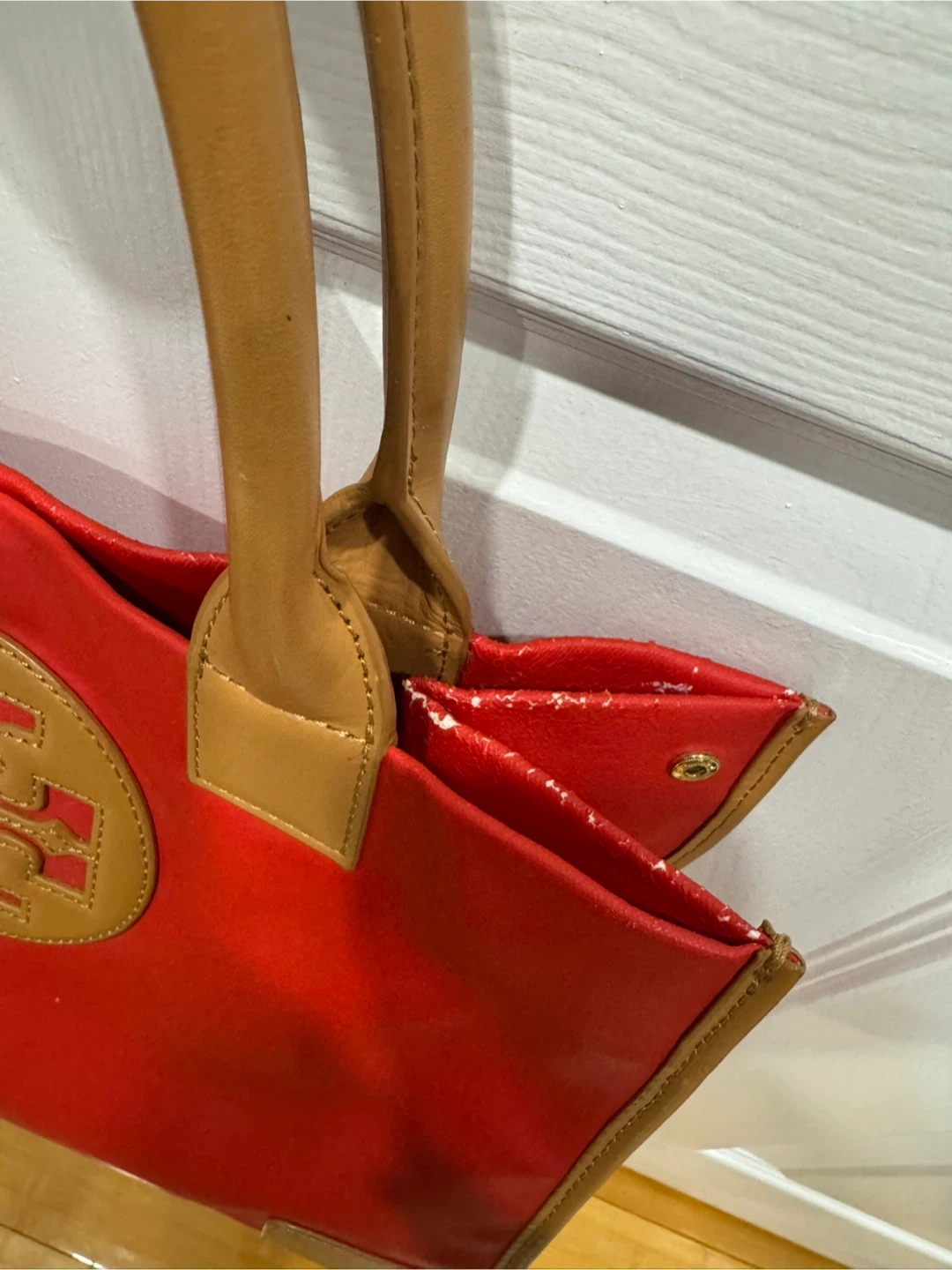 Selling a Tory Burch tote bag in red. It has the classic Tory Burch logo on the front. There are some signs of wear, as shown in the pictures. It's still a stylish bag for everyday use!