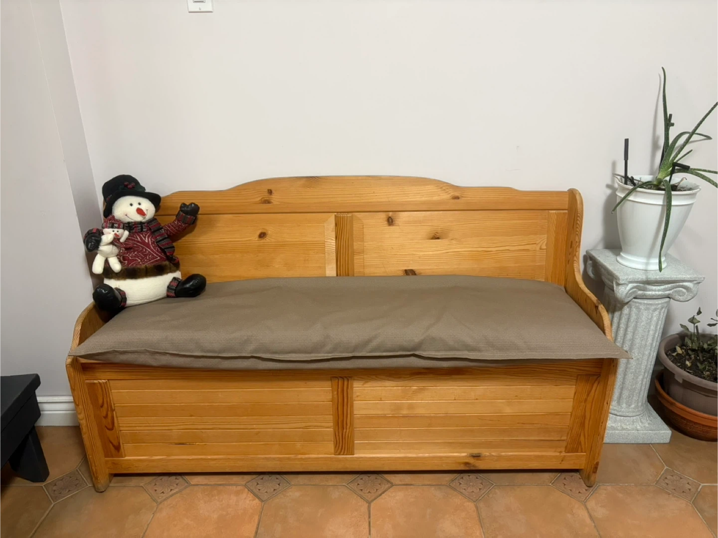 Selling a wooden storage bench in good condition. It's perfect for adding extra seating and storage to any room in your home. It can be used to store blankets, toys, or anything else you need to keep out of sight. The bench has a natural wood finish and a simple design that will complement any decor