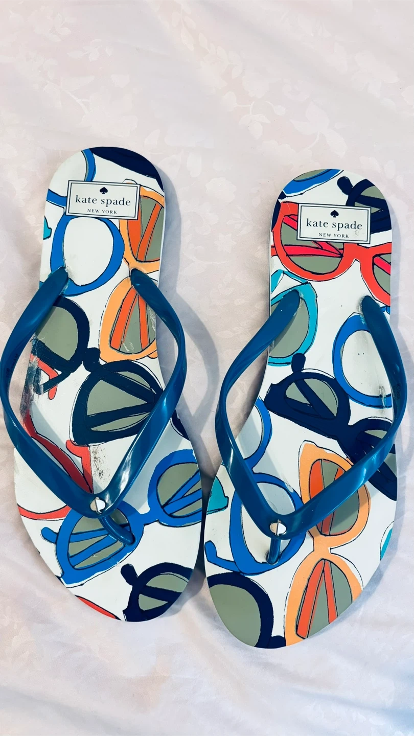 Cute Kate Spade flip flops with a fun sunglasses print! These are perfect for summer and adding a pop of color to your outfit. They have a blue strap and the Kate Spade logo on the sole