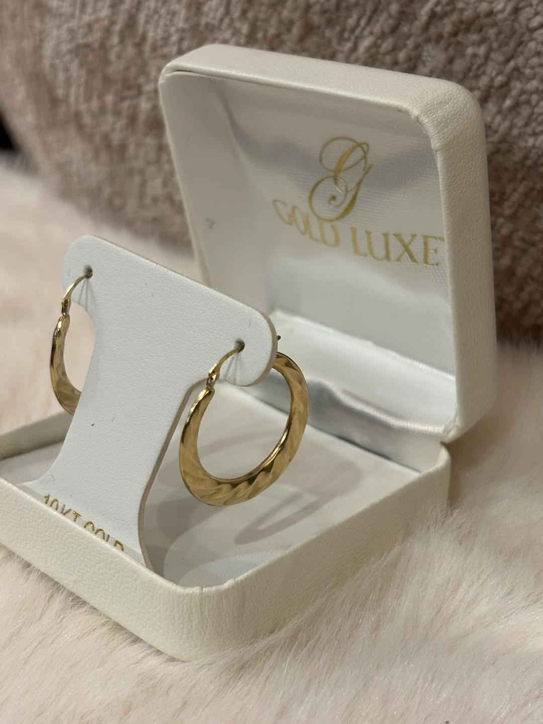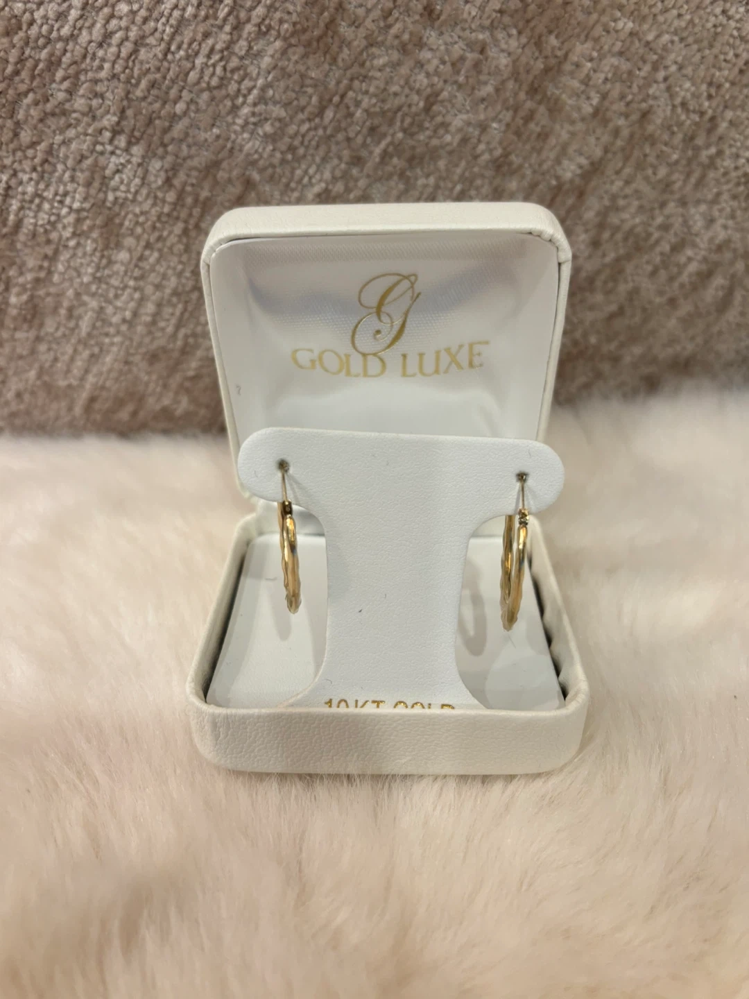 Selling a pair of Gold Luxe 10KT gold hoop earrings. They come in their original box and are brand New !!! The earrings have a lovely twisted design.