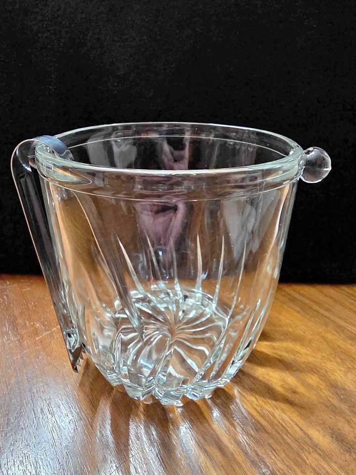 The bucket features a heavy, clear crystal glass construction with a deep-cut swirl or starburst pattern on the base and lower half.